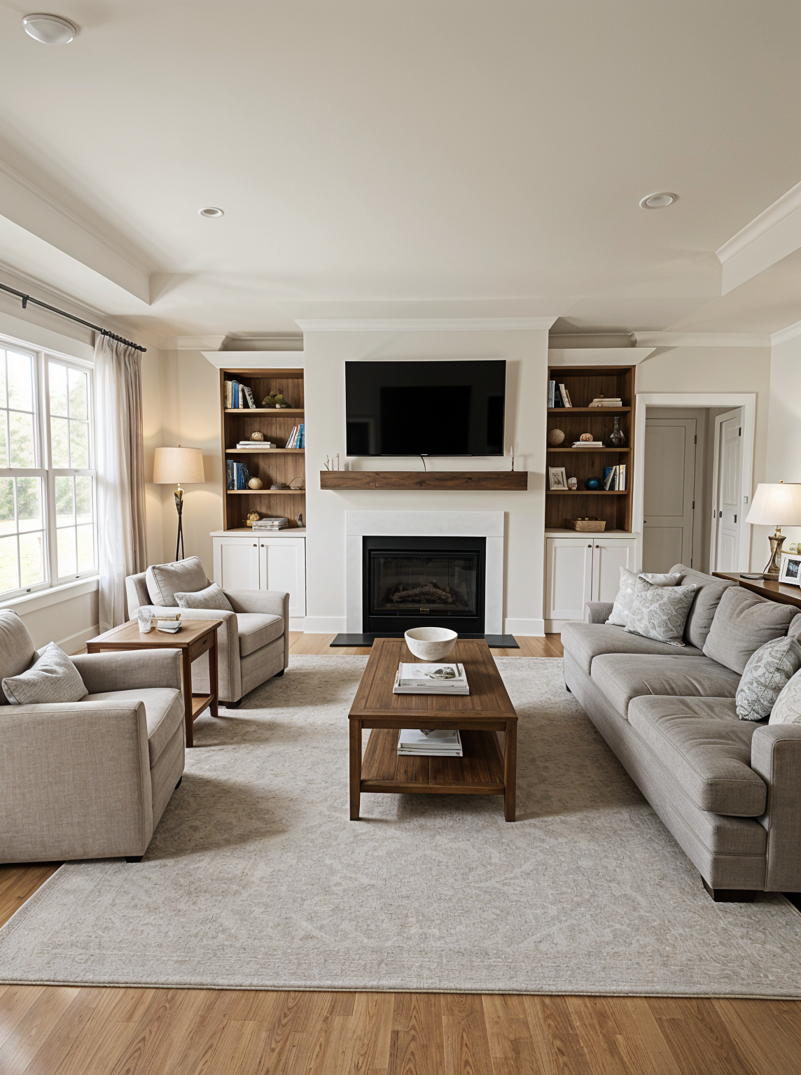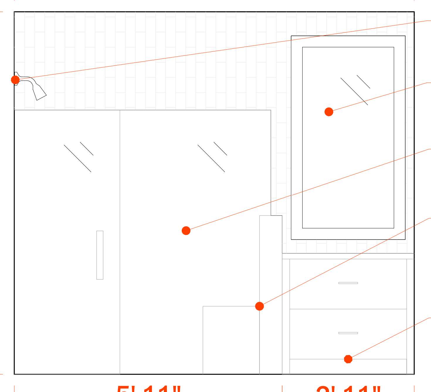 interior of a transitional bathroom wall covered in vertical large ceramic subway tile shower with glass door window above cabinetry