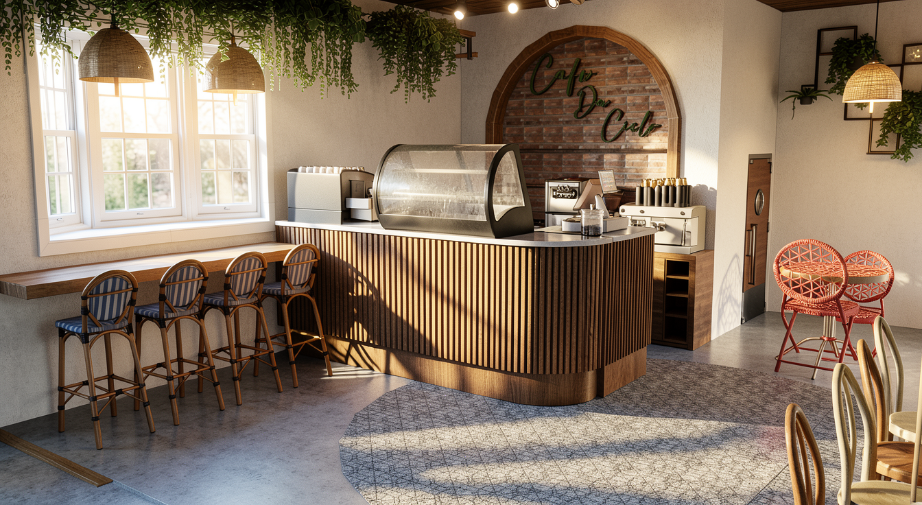 exterior shot photorealistic render of a entrance lift lobby design colours and floor pattern as is just place furniture inside rendering