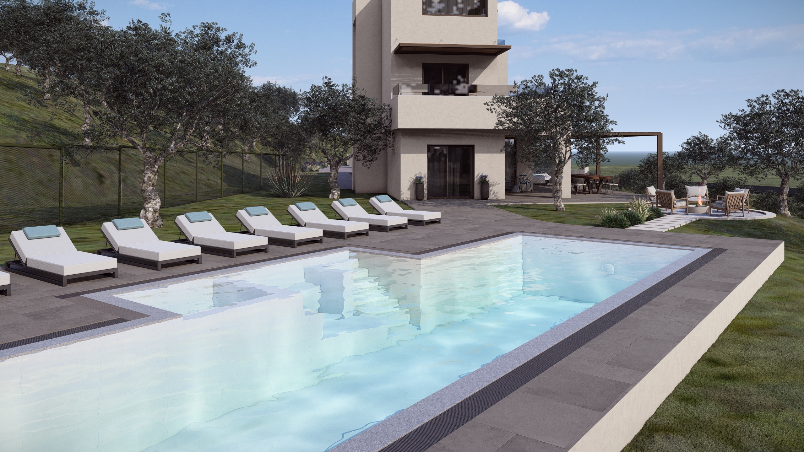 keep exactly the geometry this is a luxury villa in crete make walls with an warm beige stucco beige flooring also add people enjoying the sun beds more realistic vegetation