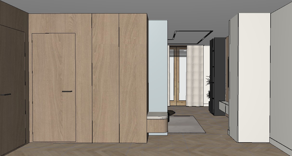 drzwi sciana i szacy sa zlicowane i z tego samego materialy po prawej stronie jeszcze jedno skrzydlo jadnej szafy nie dodawaj nic czego nie ma urealistycznij wizualizacj