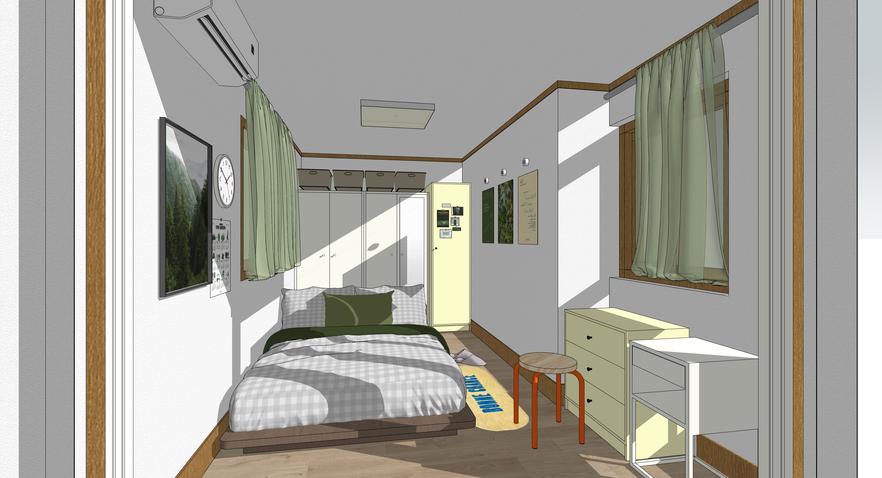 remove the lights in the ceiling on the edges instead turn on the rectangular shape lighting in the ceiling