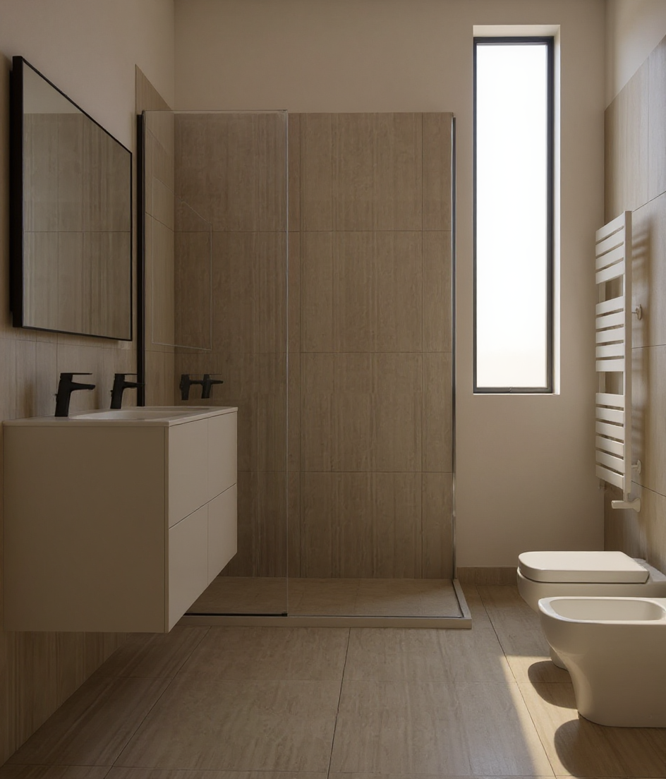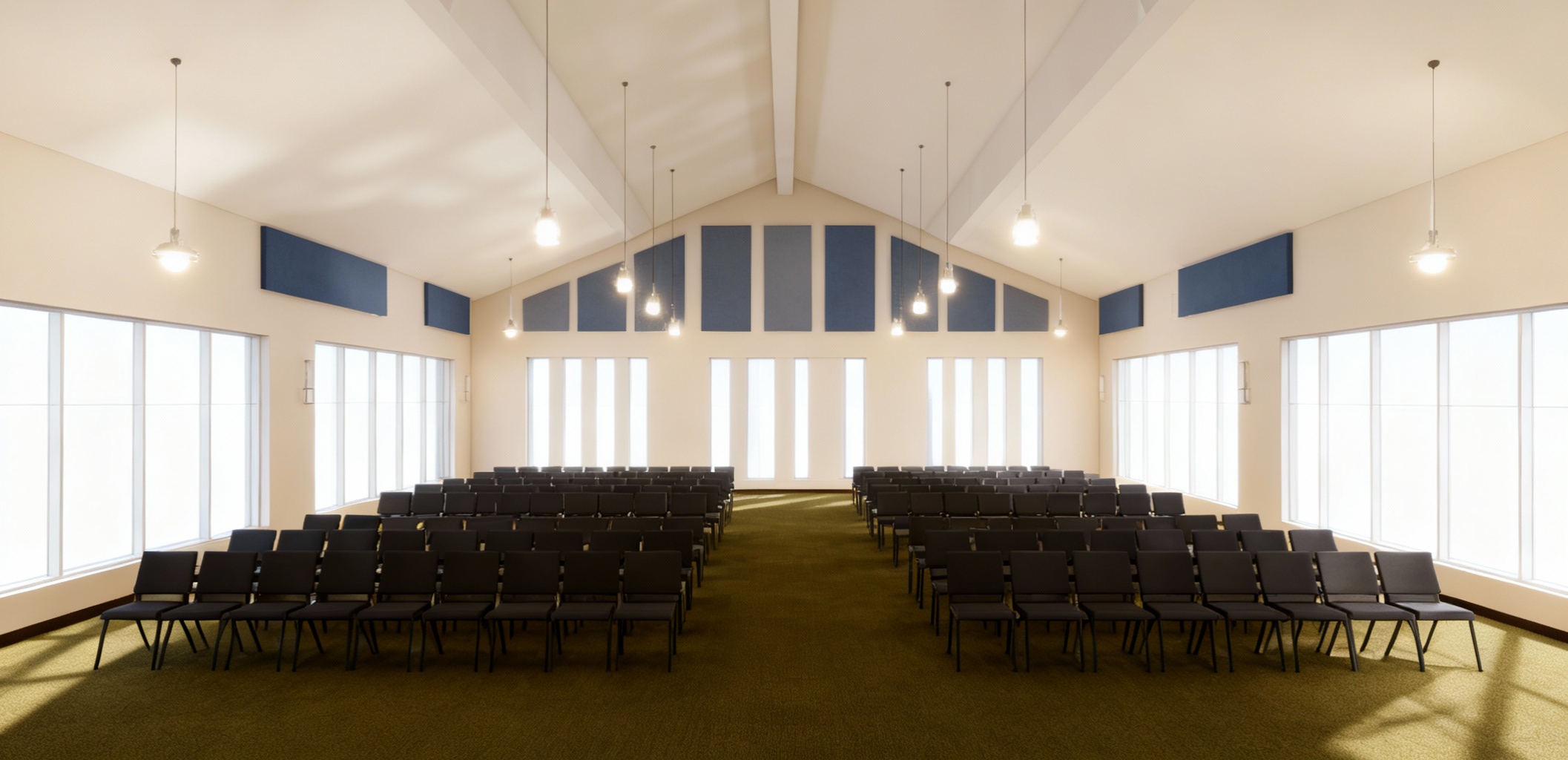 interior shot new interior using a color scheme in reference to the top two colors for walls and ceilings and the bottom two for sound panels on the wall use the pendant hanging lights as a light source for the room and the pine and oak forest as an exterior background