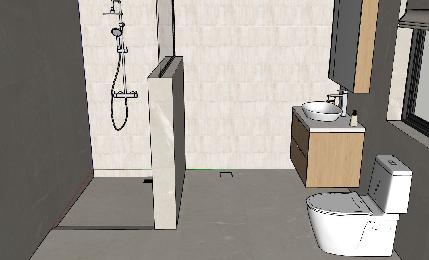 morning sunlight from window soft illumination matt floor and wall finishes matt stainless steel finish mirror reflection