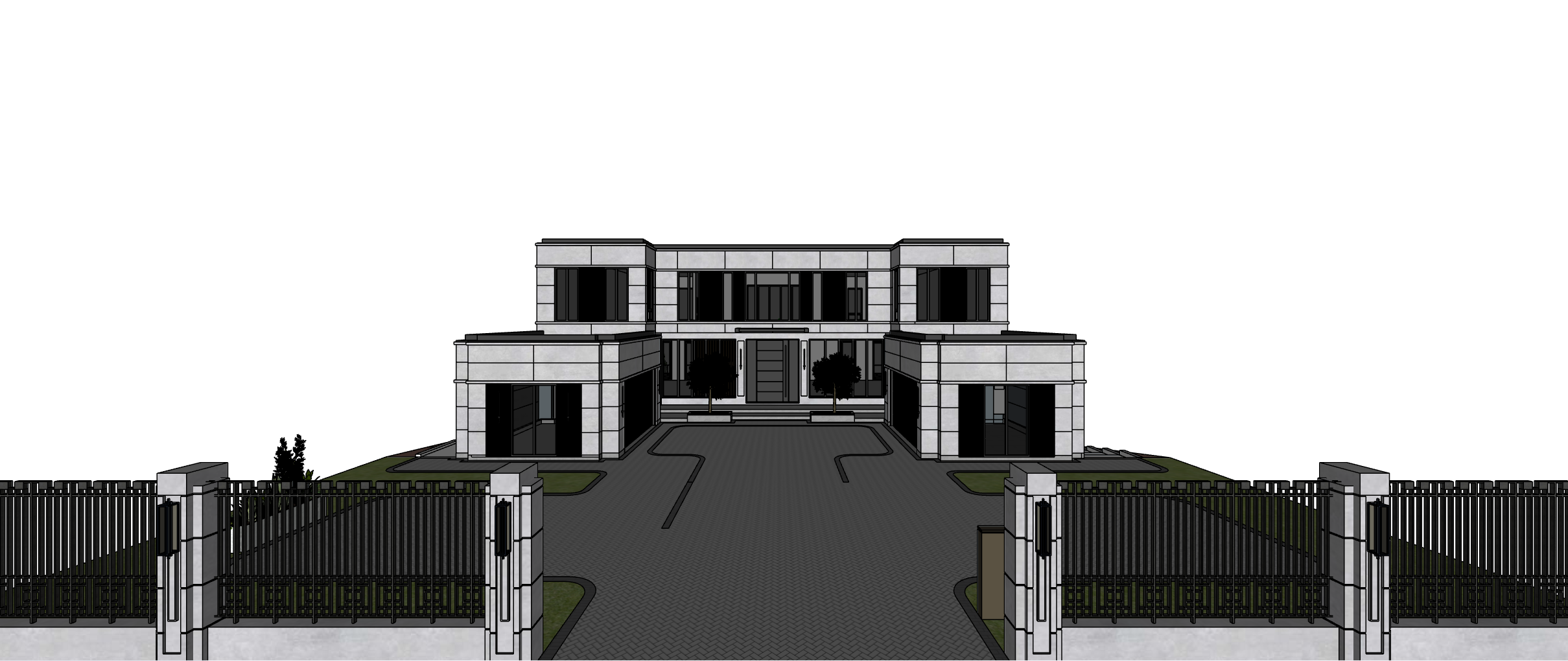 photorealistic exterior render of this house keep the exact sketchup structure proportions rooflines windows doors driveway and layout do not redesign anything use realistic modern materials smooth stucco natural stone wood soffits dark metal frames clear reflective glass concrete driveway golden hour lighting soft natural shadows realistic sky reflections clean landscaping luxury curb appeal architectural photography sharp detailed natural colors very realistic