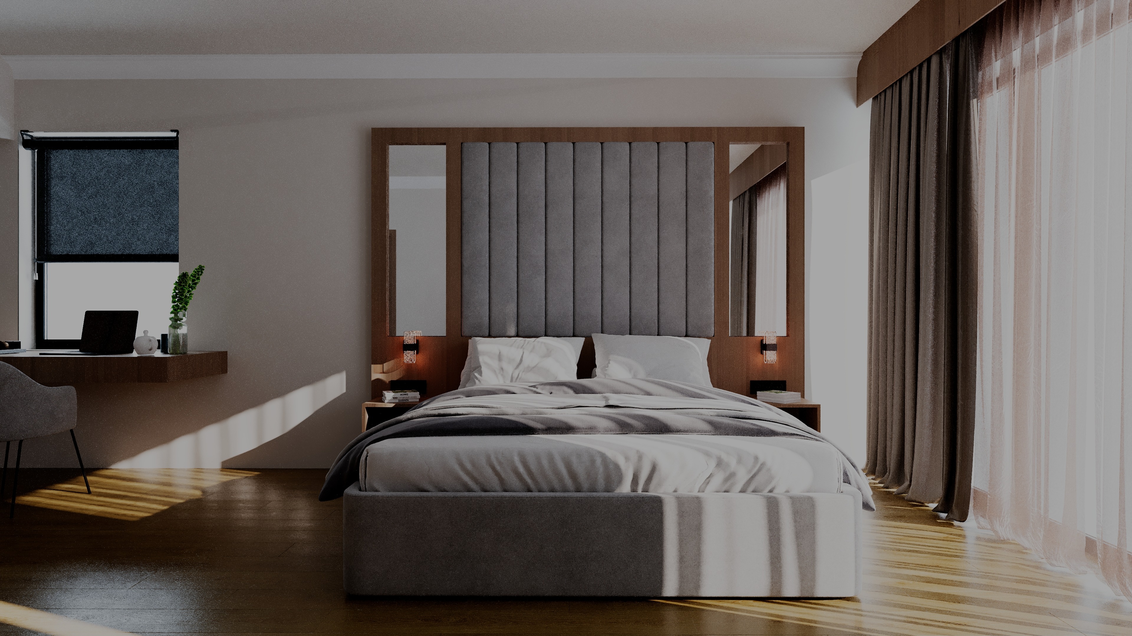 enhance this bedroom render into an ultra realistic high end interior visualization while keeping the design completely unchanged do not change anything in the layout furniture design bed shape headboard design mirrors nightstands desk chair curtain design window treatment wall design floor material lighting placement decor placement proportions or camera angle preserve the exact composition and design exactly as shown focus only on making the render look more realistic refined and professionally photographed improve realism with bed upholstery soft premium fabric with realistic texture fine weave subtle tonal variation natural shading and believable edge softness bedding highly realistic white sheets pillows and duvet with natural folds weight layering creases and soft cotton texture headboard preserve the exact vertical upholstered panel design and surrounding wood frame but make the materials richer and more realistic with better depth subtle fabric texture and realistic wood grain wood finishes realistic dark warm wood tone with elegant natural grain seamless texture mapping subtle variation and premium matte satin finish mirrors realistic reflection proper depth and clean edge definition without distortion curtains and sheers realistic fabric transparency thickness folds drape and soft light interaction flooring realistic dark wood floor with natural grain depth accurate plank definition and subtle soft reflections desk and chair improve material realism only without changing form or placement wall surfaces smooth painted finish with subtle natural texture and soft shadow falloff improve the lighting while keeping the same lighting concept maintain the same daylight direction and general mood make sunlight and curtain filtered light feel physically accurate and natural improve soft shadows contact shadows and bounce light make the bedside lights feel realistic and integrated reduce render flatness and noise improve exposure balance so bright areas near the window stay believable and not blown out create a premium architectural photography atmosphere make the render feel like a real luxury interior photo realistic global illumination subtle ambient occlusion in corners joints and fabric folds cleaner material separation realistic contrast and depth high resolution sharpness with natural softness no artificial or plastic looking surfaces important do not redesign do not add objects do not remove objects do not move anything do not change colors and do not alter the styling only improve realism and keep the design exactly the same negative prompt redesign changed bed design changed headboard changed mirrors changed curtains changed desk changed chair changed layout changed camera angle changed materials changed colors extra decor missing objects distorted reflections blurry details overexposed window oversaturated light noisy render cartoon look stylized render altered composition if you want i can make this one stronger for archsynth with a more aggressive ultra photoreal ending line