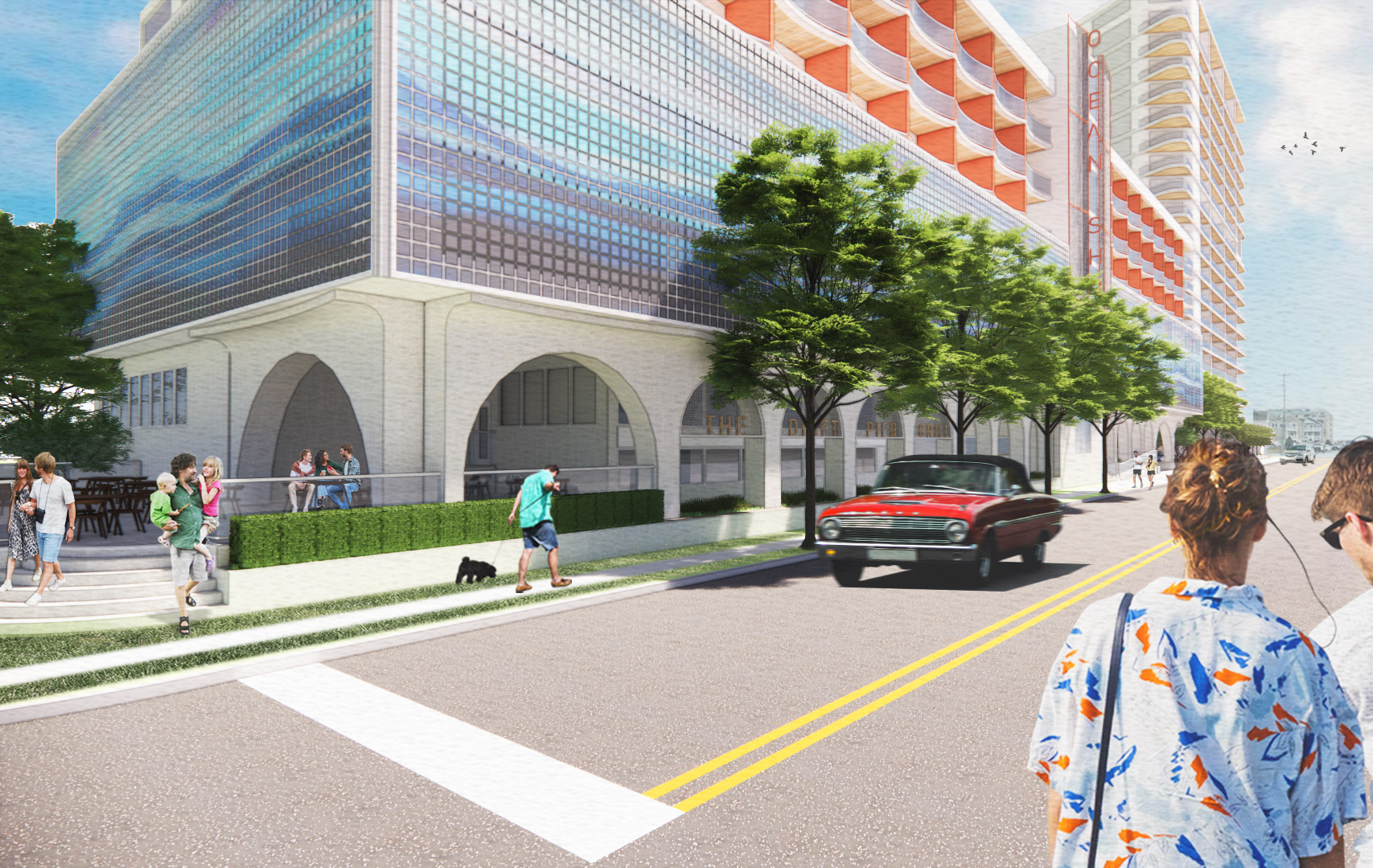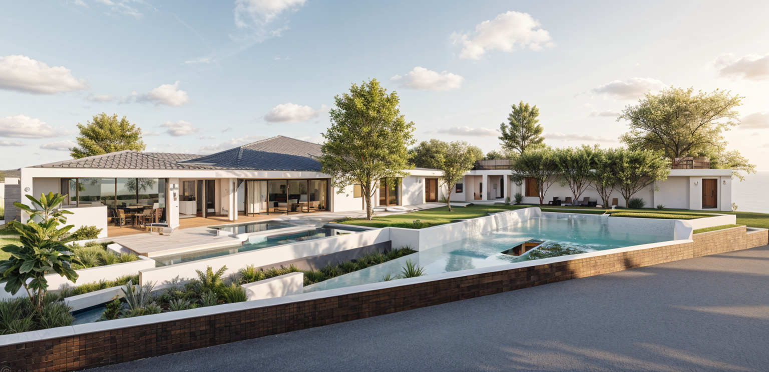 convert to conceptual black ink architectural sketch maintaing existing colors expressive linework with varied weights minimal detail light hatching only keep main building crisp and dominant fade site context to soft low contrast outlines preserve original composition and camera