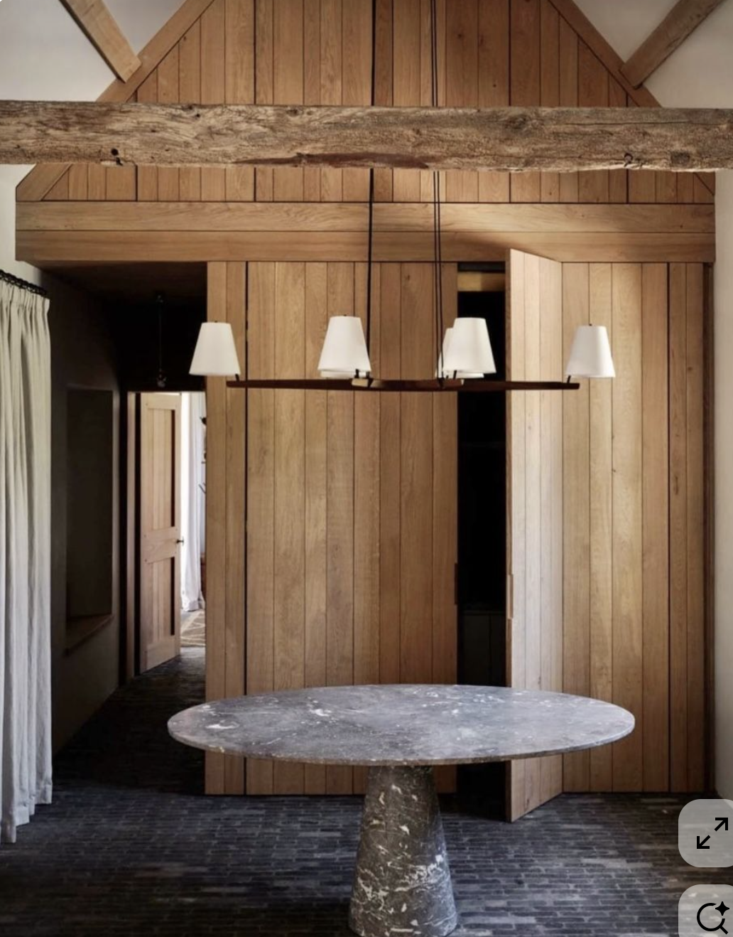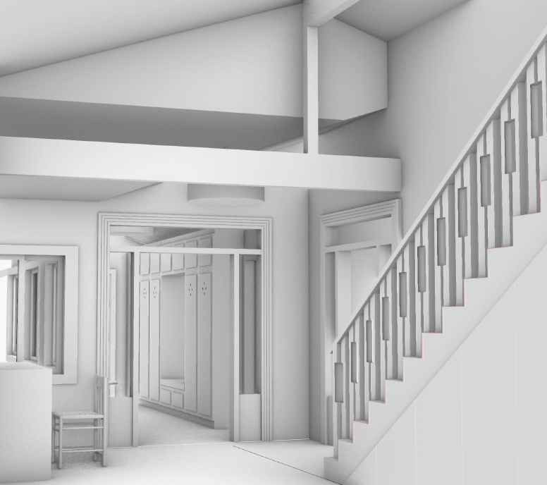 exterior shot render a cozy and inviting hallway with a vaulted ceiling featuring soft warm lighting the walls should be painted in a soothing pastel cream while the windows and trim are highlighted in a clean crisp white the seating area is upholstered in a light taupe fabric with a round white table for contrast the long wall features built in storage with light oak wood accents create a calm and welcoming atmosphere with a soft glow from overhead lights and add a touch of greenery near the window for a fresh natural feel the floor is a light textured wood that complements the overall warm tones