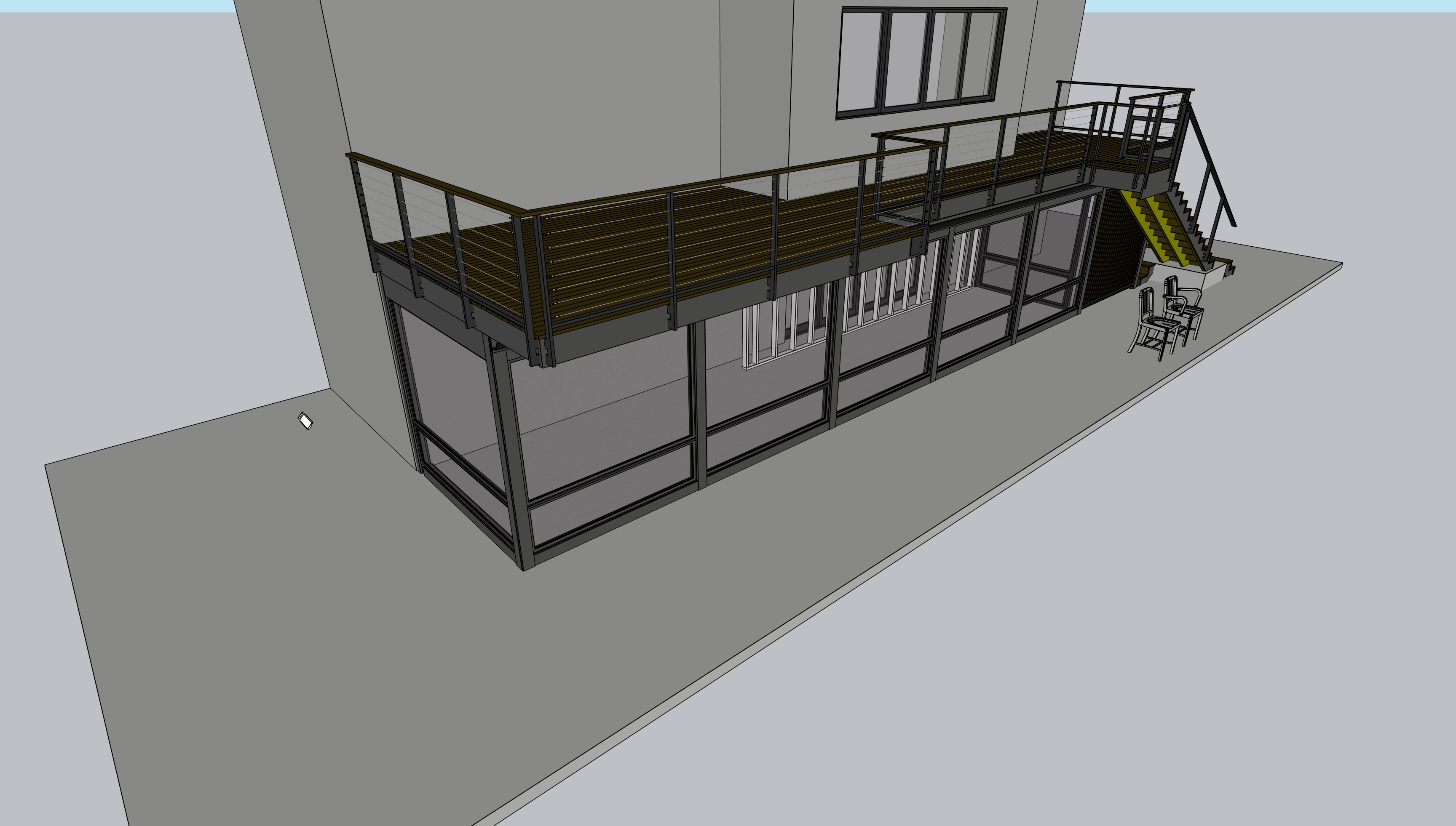 the decking is dark brown ash whereas the railing is black with stainless steel cable rails make this shot towards dusk