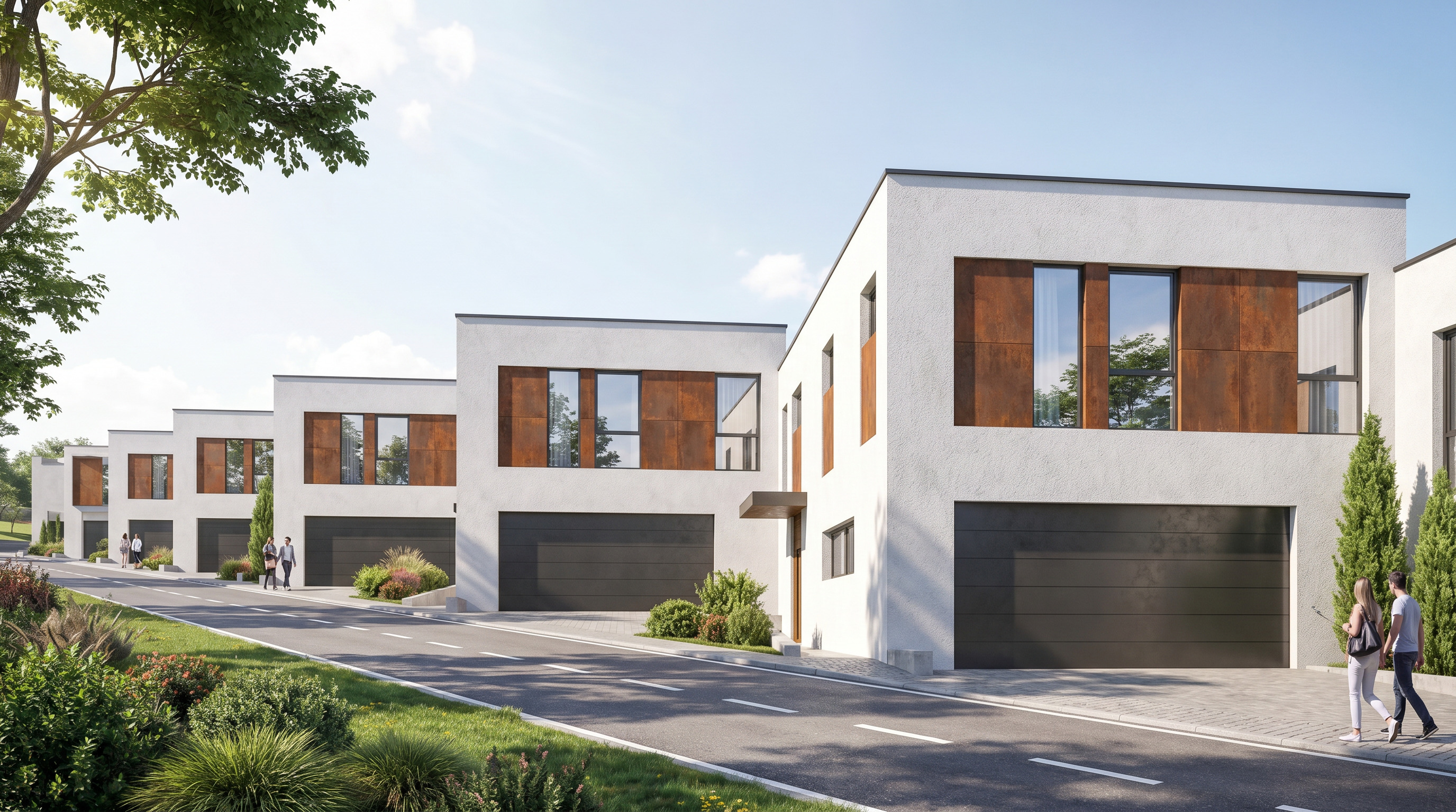 open one of the garage doors and put parked saab 9 5 inside make garage interior from visible concrete add lights in the garage show one passing blurred car on the road don t change any geometry don t change any colors and materials
