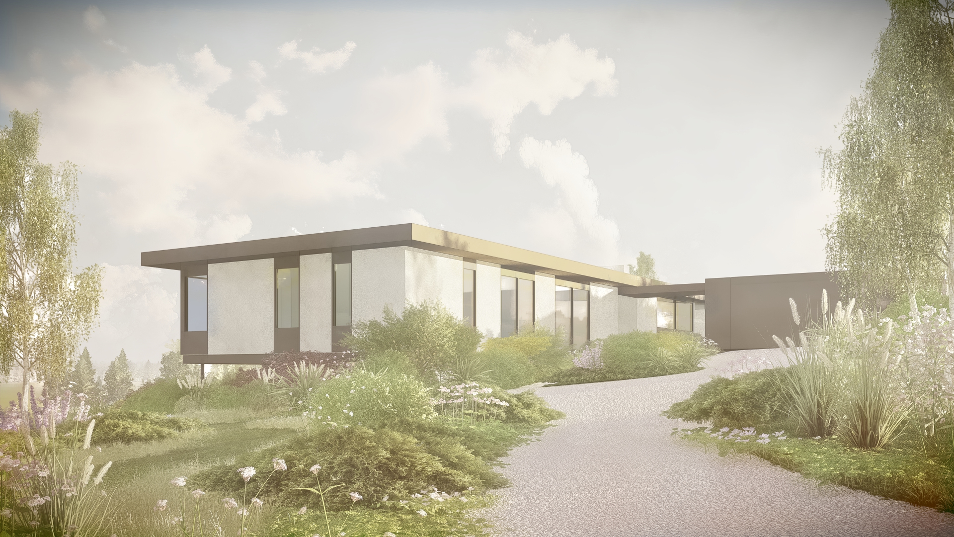 photorealistic architectural rendering of a contemporary australian rural home enhancing an existing lumion base image introduce soft atmospheric depth abundant natural light with a warm low angle sun early morning or late afternoon creating gentle highlights and soft shadows the front of the building needs direct sunlight on an oblique angle refine materiality to feel tactile and true to life metal with subtle reflectivity and imperfections glazing with realistic reflections and slight interior transparency add understated warm interior lighting 2700k 3000k to create a soft glow ensuring it feels natural and not overexposed balance interior and exterior lighting so neither dominates enhance landscaping with slight movement and realism softened edges and subtle tonal variation in grasses and foliage introduce light environmental effects e g faint haze diffused background to increase depth and atmosphere overall mood should be warm calm and evocative slightly ethereal but grounded in realism avoid overly dramatic contrast or stylisation aim for a premium architectural photography aesthetic with a cinematic softness