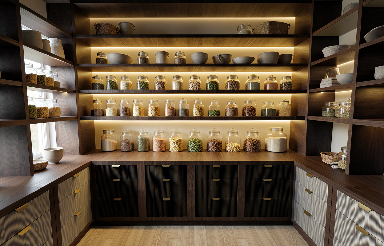 modernist exterior shot cinematic professional architectural photography of a bespoke walk in luxury pantry architectural digest cover quality realistically rendered texture on dark walnut fluted cabinet doors with minimalist brass handles ultra detailed materials lighting hierarchy primary light the scene is defined by a deep sculptural sense of dimensionality integrated ultra warm 2700k led strip lighting is tightly recessed beneath every shelf this light is subtle and indirect casting a dramatic focused downward wash over the labels and contents of the glass jars the led source itself is hidden from view secondary ambiance the background walls behind the glass jars feature a textural linen wallpaper in a warm beige tone softly illuminated by the indirect led glow contrast and depth dark rich shadows are deliberately maintained in the corners and the deepest crevices of the shelving creating a sophisticated chiaroscuro effect the edges of the wood shelves are highlighted while the gaps are shadowed reflections the hundreds of uniform glass apothecary jars filled with grains spices and dried herbs catch warm point light specular highlights from the leds making them glimmer styling composition perfectly curated shelves styled with organic modern ceramics woven baskets and uniform labels soft natural side ambient daylight from an unseen window balances the warmth 8k resolution photorealistic depth of field architecture