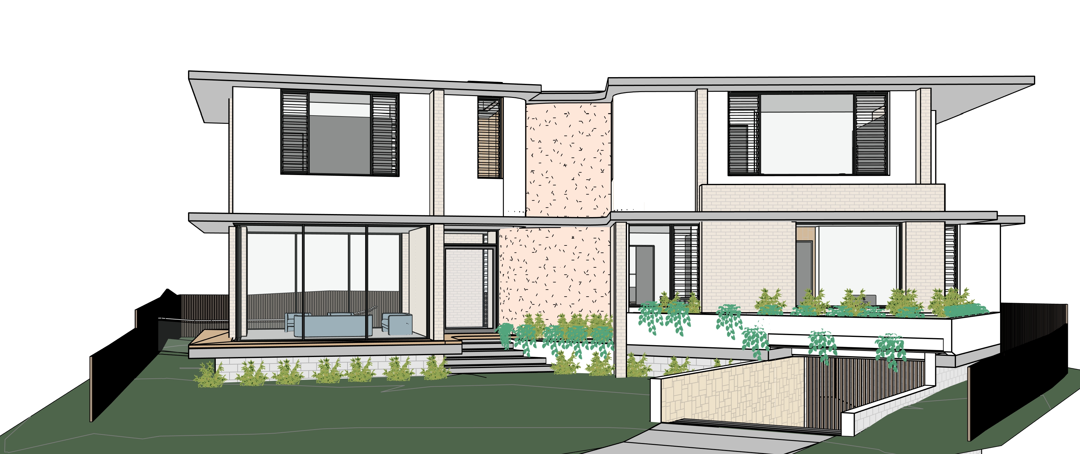 a modern two story house with a flat roof featuring large windows with black shutters the facade is a mix of white and pale beige bricks surrounded by lush green shrubs and plants the atmosphere is serene and sophisticated with a soft golden sunset light casting gentle shadows the grass is rich emerald green and the sky is a gradient of warm oranges and pinks the driveway and paths are light gray the overall mood is peaceful and inviting