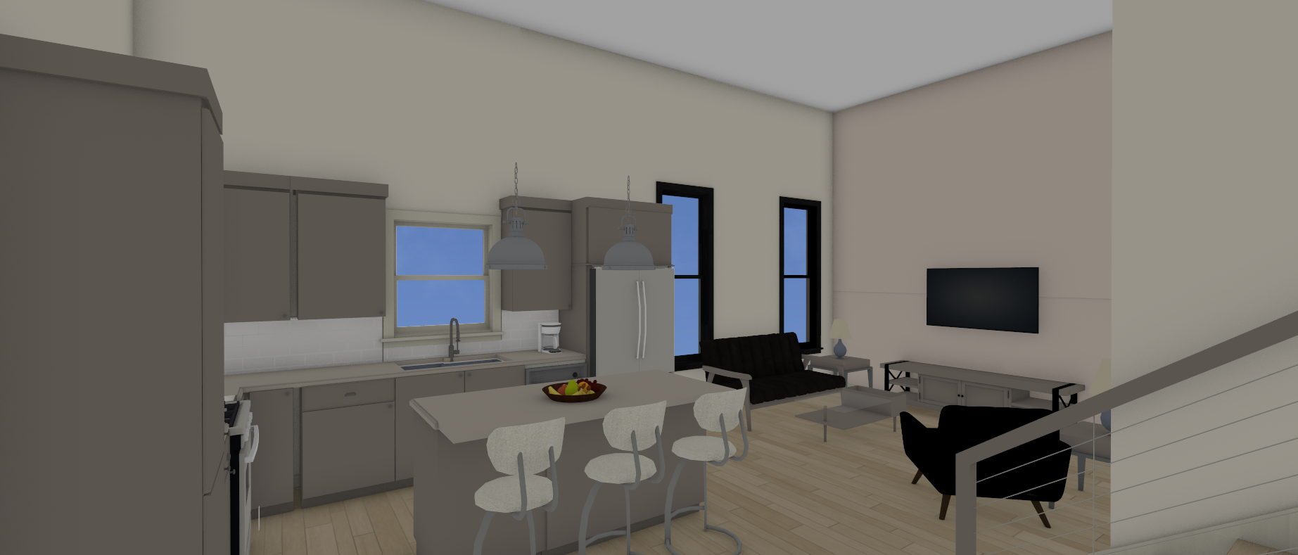 create a high resolution photorealistic interior rendering based on the reference image mnt data fd8ac126 5559 495d 8fd3 74668504b8c7 png retain all architectural and interior features exactly as shown the kitchen layout island with bar stools pendant lights cabinetry appliances flooring living room furniture stair railing wall colors enhance materials to realistic textures such as wood grain fabric metal and glass through all windows replace the exterior view with a lush forest setting filled with dense greenery tall trees and soft sunlight shining through the branches creating natural light reflections inside the room maintain consistent lighting accurate shadows and a clean modern photorealistic finish