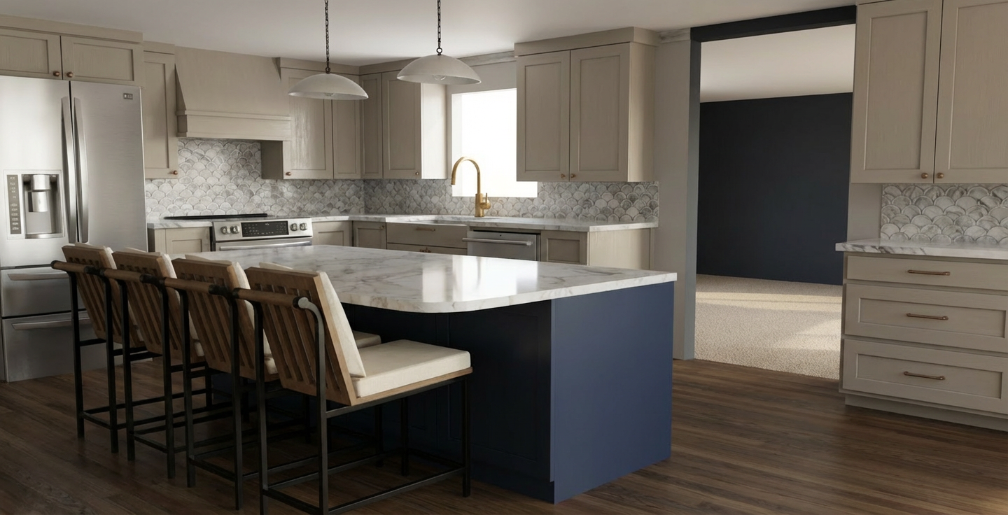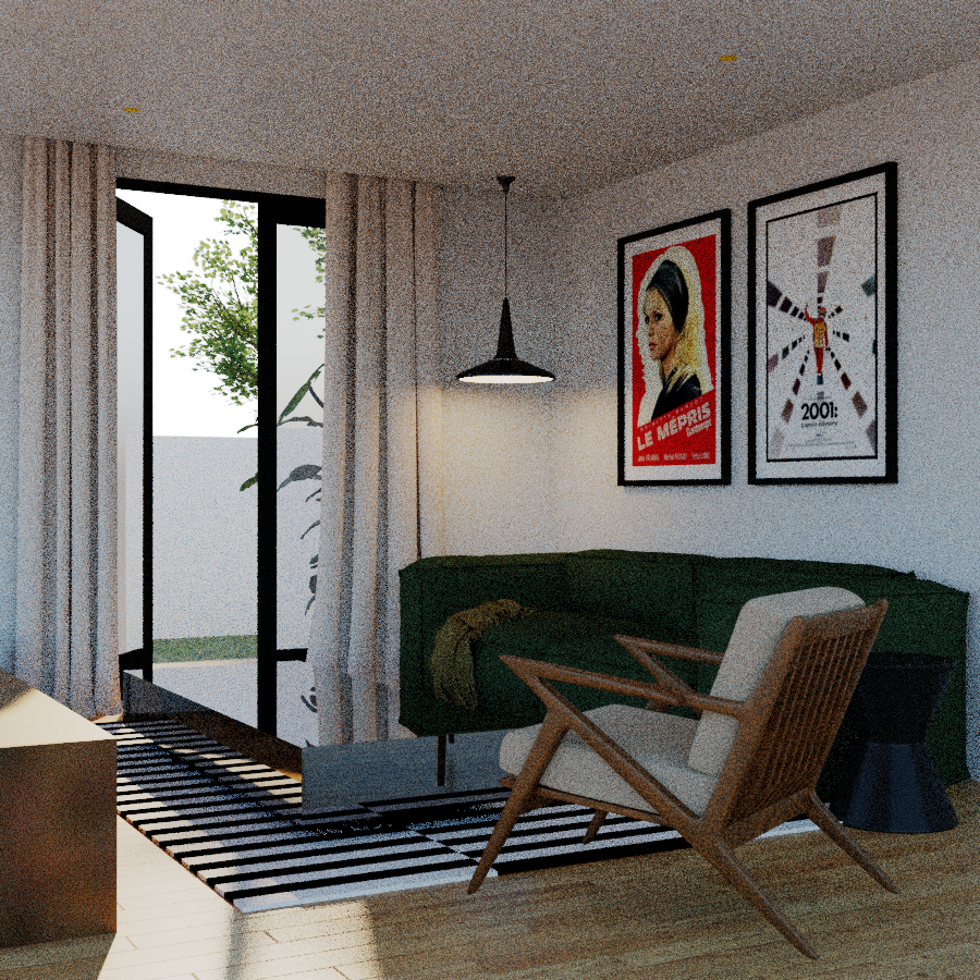 editorial hyperrealistic interior scene of a contemporary living room medium height perspective poetic atmosphere enhance the perception of lighting while respecting the existing light sources warm sunset light enters through the window creating soft diffused shadows and a calm cinematic ambiance the pendant lamp remains on emitting a warm glow 3000k with a matte black steel finish the overall mood is intimate soft and editorial living room with a floor to ceiling window and dark frames curtains maintain the same fabric pattern and natural fall as in the reference image outside a private ground level garden typical of a residential complex a white boundary wall is visible and beyond it an open sky and a leafy tree can be seen suggesting depth and openness l shaped sofa upholstered in corduroy fabric in the exact same desaturated bottle green tone as the reference image slightly muted with subtle gray undertones not overly saturated maintain realistic fabric texture wooden armchair in walnut with angular structure upholstered in textured beige fabric low walnut wood cabinet partially visible on the left low coffee table with mirrored finish realistic reflections walls painted in off white with a very subtle gray undertone add baseboards skirting boards in the same color where walls meet the floor floor in oak herringbone wood with natural grain and subtle variation rug similar to ikea stockholm ivory base not pure white with very dark gray stripes not pure black on the wall two framed artworks with thin black frames poster of contempt le m pris by jean luc godard poster of a clockwork orange ceiling with small recessed spotlights visible but turned off highly realistic materials and textures accurate light behavior on fabrics wood grain detail soft reflections on glass and mirror surfaces cinematic composition editorial interior photography style ultra high resolution soft depth of field subtle film grain
