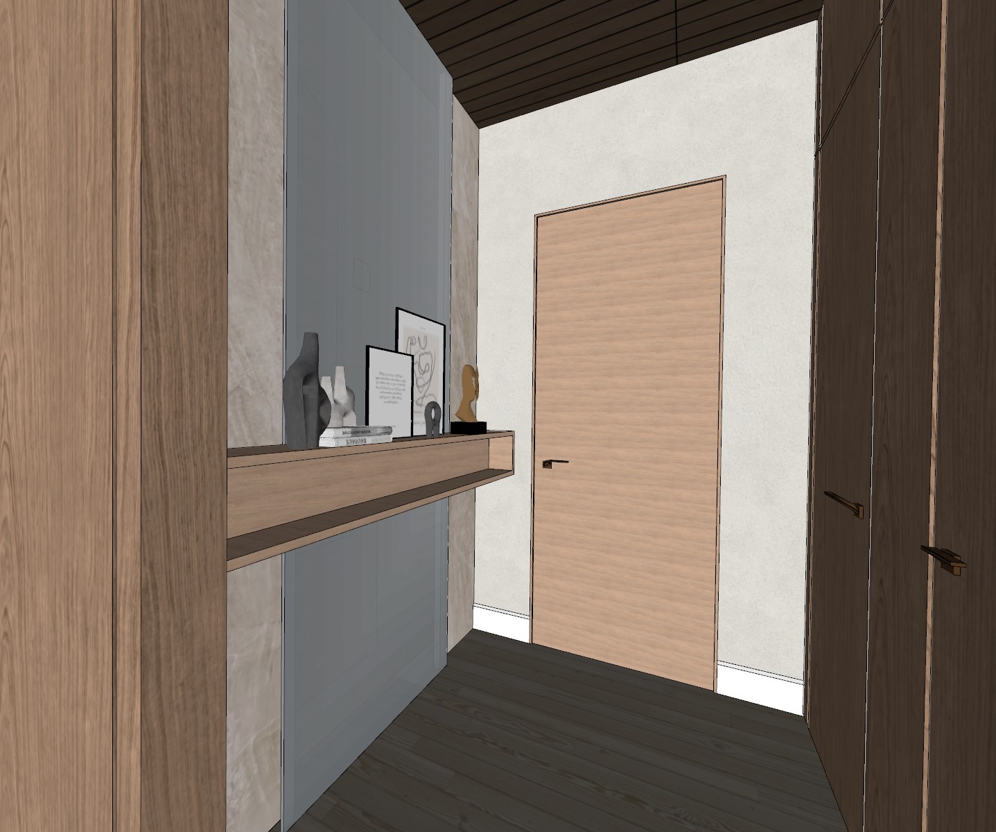 make it look realistic make wood floor lighter and with a taupe tone glass finish is a frameless mirror