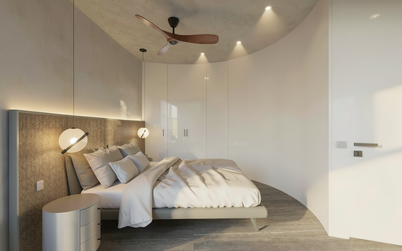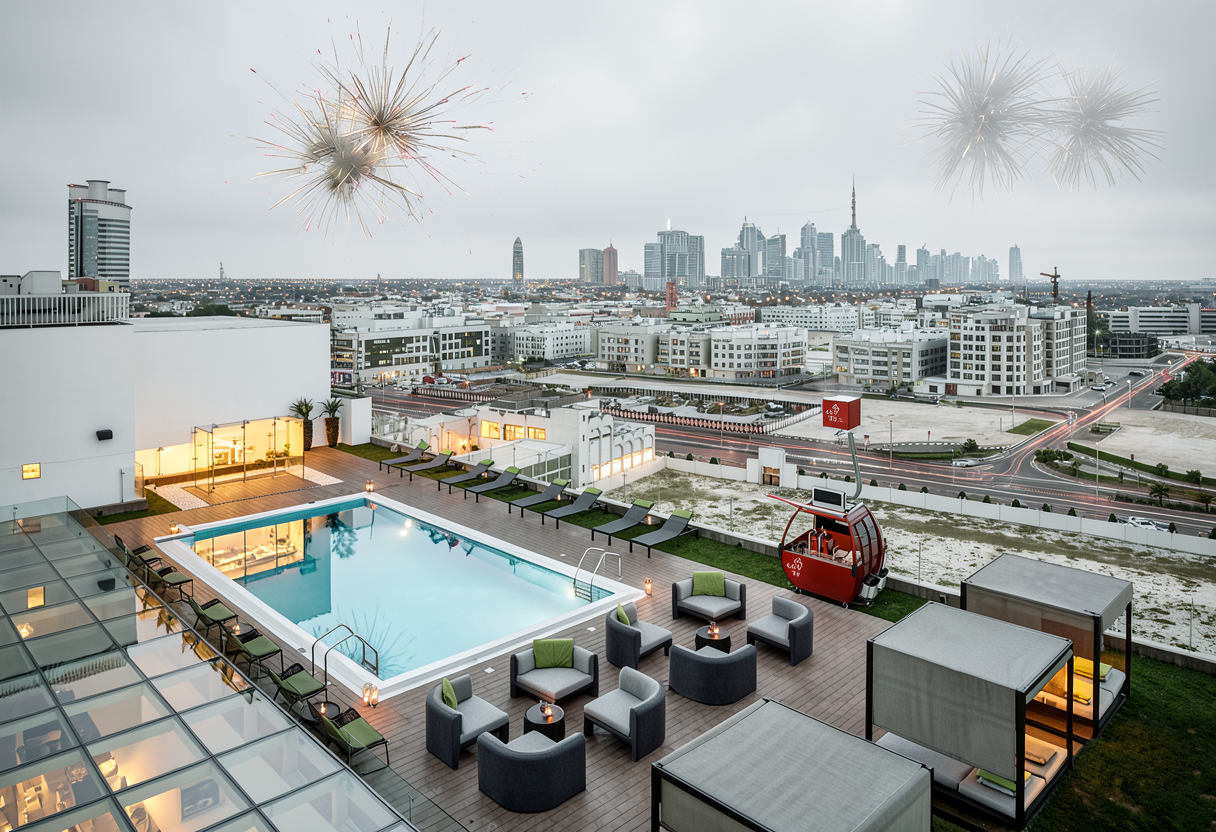 exterior shot auditorium interior please follow the model geometry fill seatings and apply textures and colours led light from vertical panel edges black ceiling with spotlights