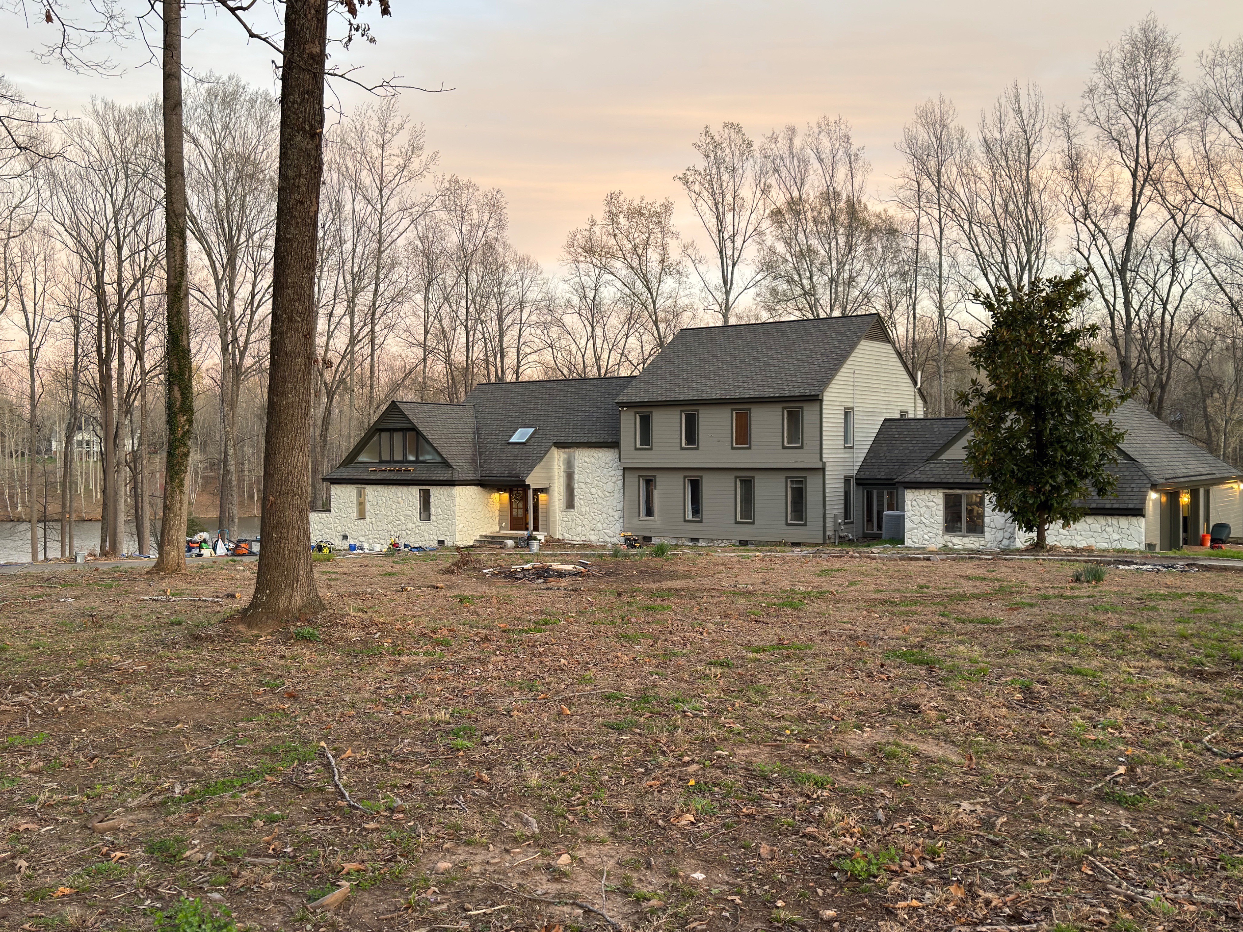 use the provided image as the exact base do not alter the architecture structure rooflines windows materials or proportions of the home in any way this is a real completed home only enhance the landscaping site and overall presentation transform the raw bare yard into a fully completed high end luxury lakefront landscape consistent with a 2m 3m custom home in a wooded waterfront setting ground plane replace all bare dirt and patchy grass with lush healthy deep green sod lawn the lawn should feel established dense and perfectly maintained with subtle natural variation not artificial grading flow introduce clean intentional grading that gently slopes from the home toward the lake ensure smooth transitions with no construction remnants add subtle contouring to create visual depth and drainage realism foundation landscaping install layered professional foundation plantings along the entire front elevation low structured boxwoods and dwarf hollies for base layer mid height ornamental shrubs hydrangea loropetalum or similar occasional vertical accents small ornamental trees or columnar evergreens dark brown black triple shredded mulch beds with crisp defined edges natural stone or metal edging for clean separation hardscape add a clean elegant walkway from driveway approach to front entry material large format natural stone or high end pavers slight curves for a custom organic feel integrate subtle stepping stone transitions if needed add minimal but refined hardscape near entry small landing expansion or welcoming pad at front door optional low stone retaining edges if grading calls for it trees site enhancement preserve all existing mature trees but clean them up remove visual clutter at base add mulch rings around select trees enhance spacing so the property feels curated not overgrown add a few strategically placed ornamental trees closer to the house for balance lake connection visually enhance the connection to the lake add a soft natural pathway or mowed path leading toward the water keep it subtle and elegant not overbuilt slight clearing toward water to improve sightline lighting add warm subtle landscape lighting uplighting on key trees soft washes on stone facade path lights along walkway lighting should feel high end and understated not overly bright driveway edge if visible or implied define edges with clean transitions either turf edge gravel strip or planting border atmosphere keep lighting consistent with golden hour early evening for warmth and emotional appeal enhance overall richness contrast and realism without making it look artificial style direction luxury modern farmhouse meets refined lake estate natural organic high end not flashy not overly manicured important this should look like a real finished property ready for a high end listing not a conceptual rendering do not add unrealistic features no fountains no excessive hardscape no resort style elements keep everything believable buildable and regionally appropriate output photorealistic marketing ready exterior image that elevates the property into a premium finished estate