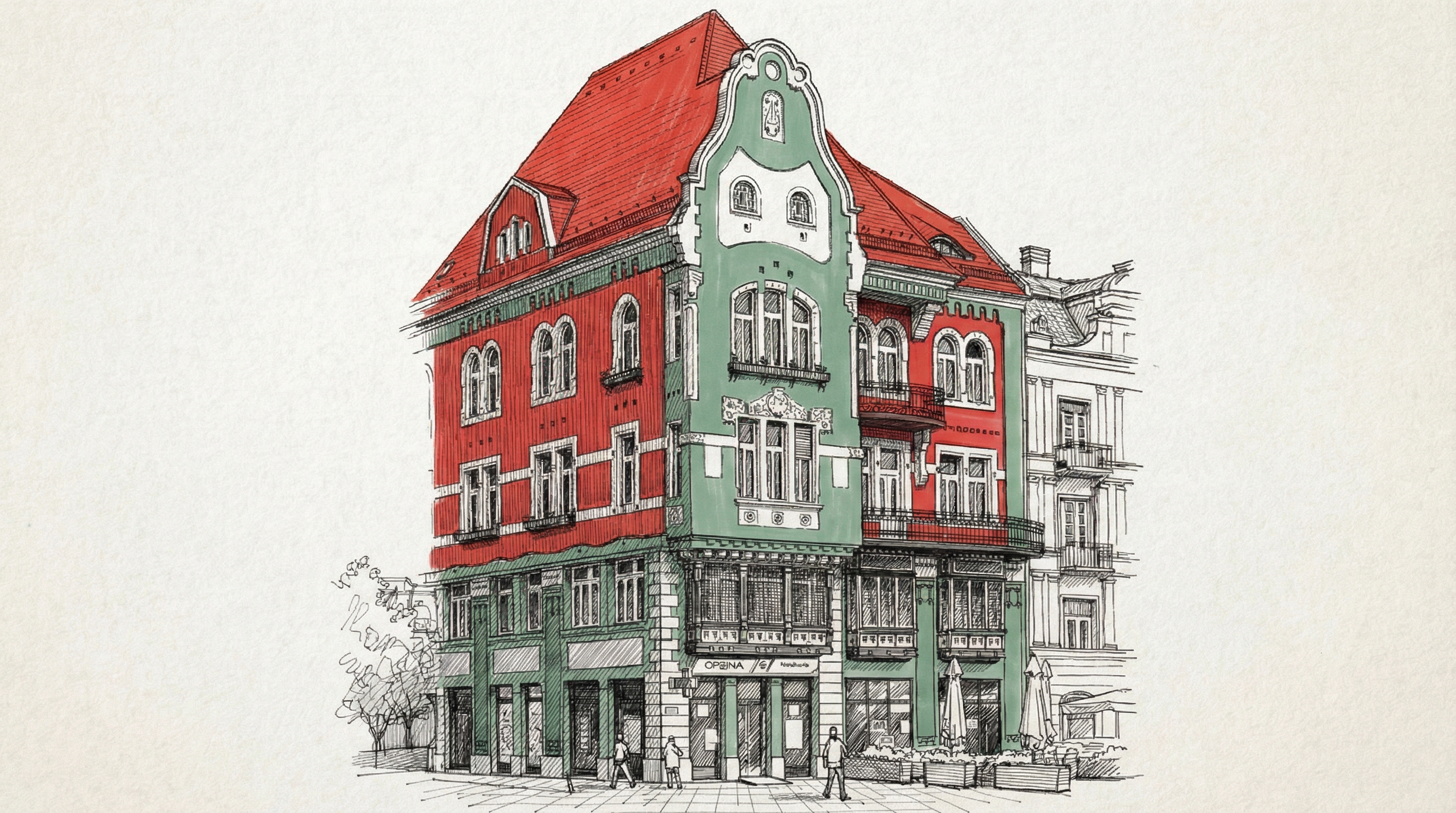 beautyful windy clouds few people in 1910 style dressings and style walking and talking correct to 2 point perspective