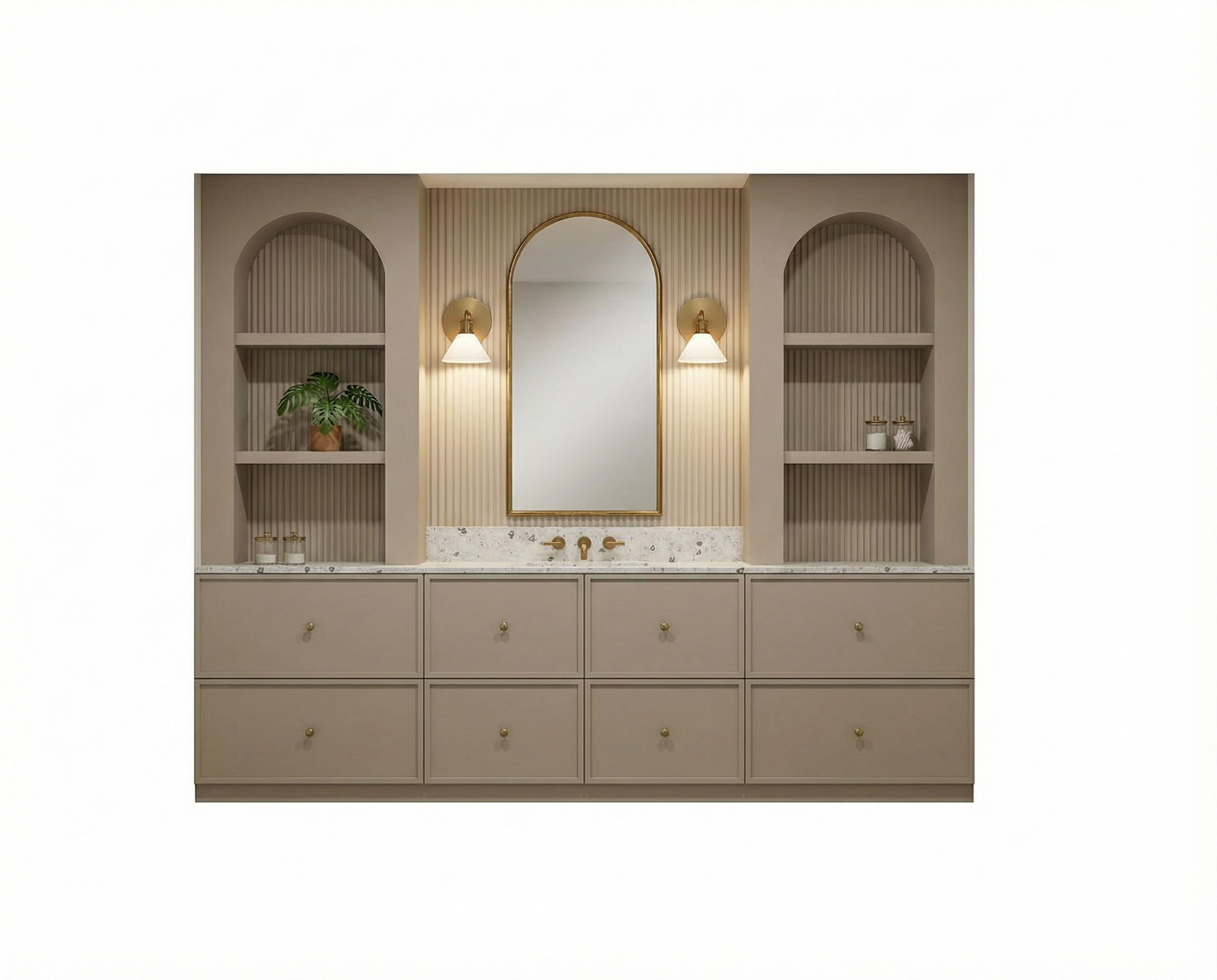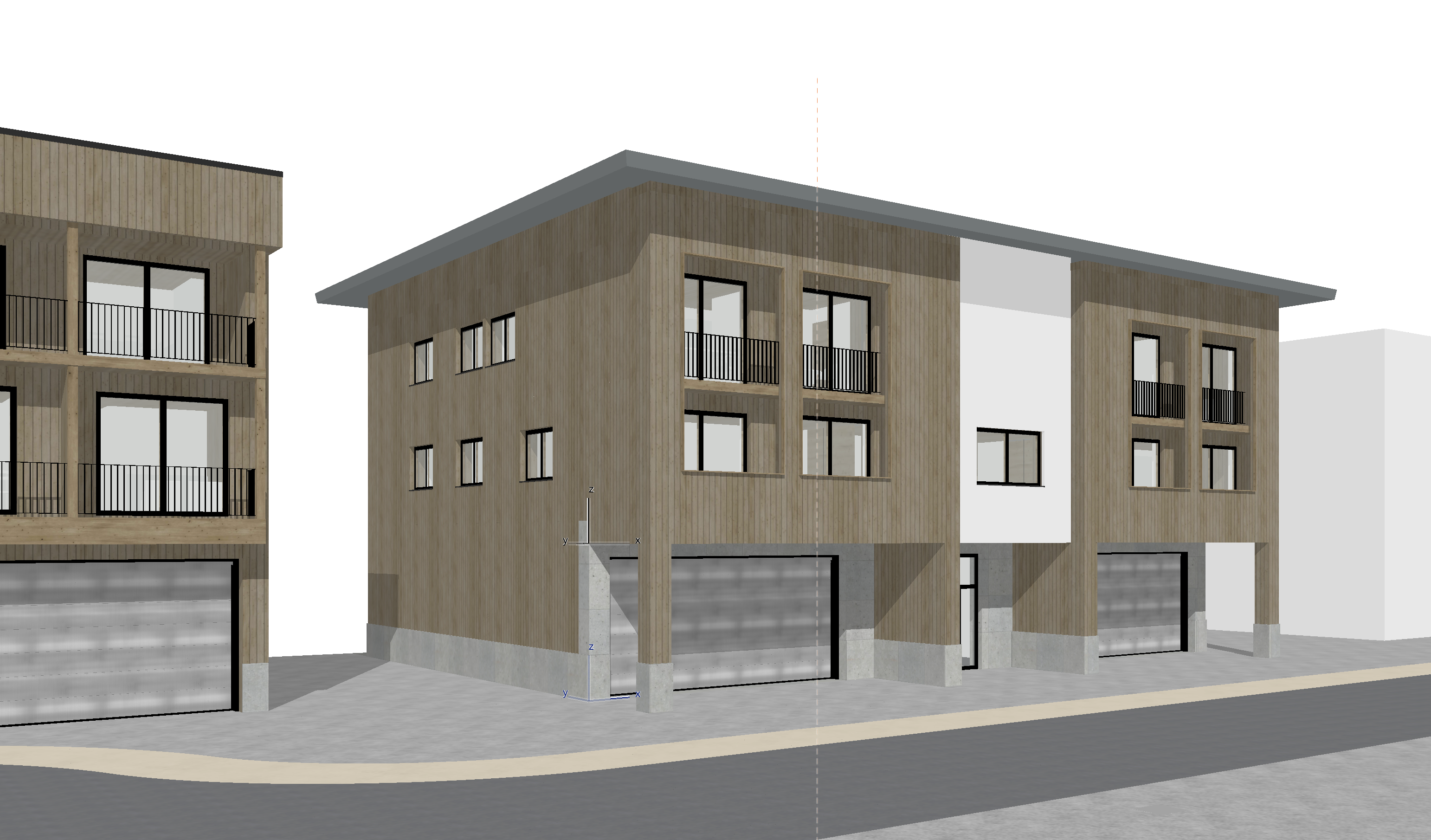 a modern two story building with a wooden facade featuring large windows use warm amber tones for the wood reflecting a cozy inviting atmosphere the window frames are a sleek charcoal black providing a contemporary contrast the garage doors are a soft gray blending seamlessly with a minimalist design the sidewalk and driveway are a light stone color contributing to an elegant urban setting the sky is clear with a soft pastel blue tone creating a serene and sunny ambiance include a small artistic sculpture in the front yard in brushed bronze adding a touch of sophistication