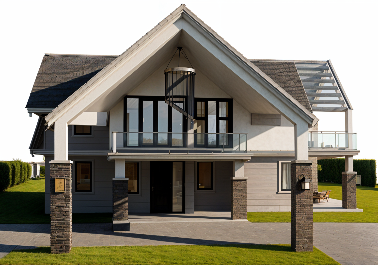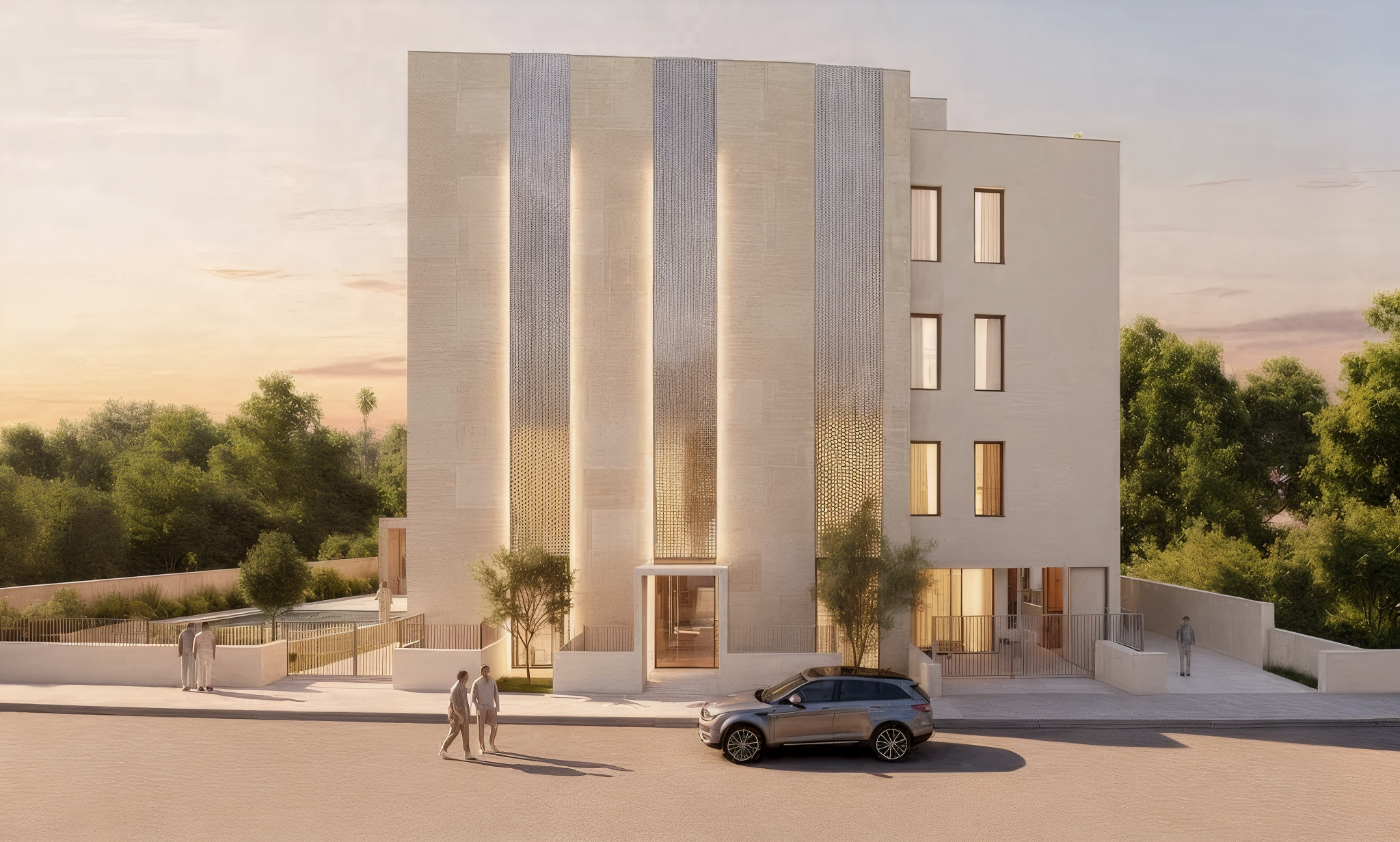 create a serene architectural scene at sunrise featuring a modern rectangular building with smooth cream colored walls and elegant silver vertical elements illuminate the building with a gentle warm glow reflecting the early light surround the structure with lush vibrant green trees adding a touch of nature position a sleek metallic car parked subtly in front of the building capture a few people dressed in light pastel clothing walking and standing casually on a smooth light gray pavement emphasize a peaceful and sophisticated atmosphere with soft hues of pink and orange in the sky conveying a calm morning ambiance