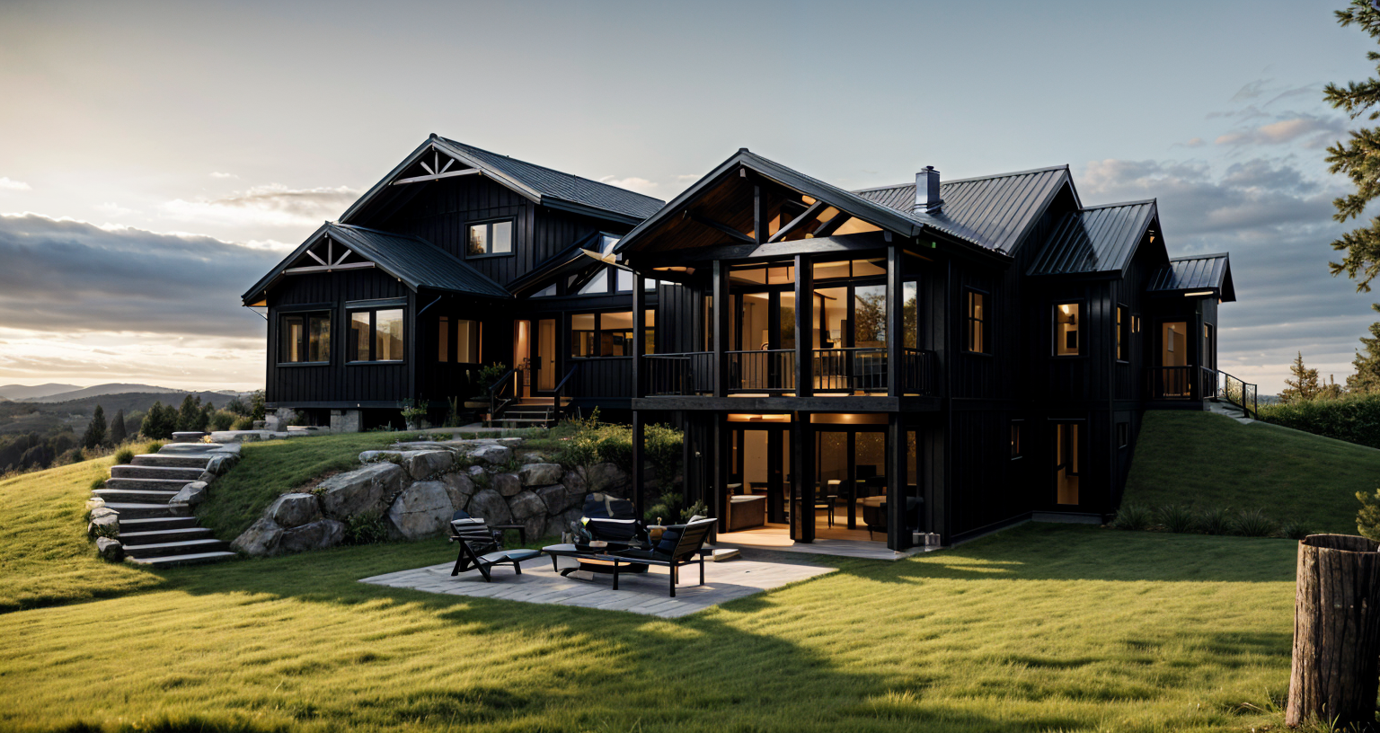 forest quebec sunny morning close to noon black metal roof black windows black doors dark exterior finishes 4k architecture