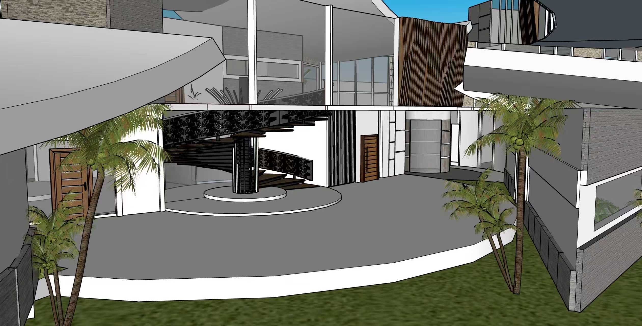 modernist perspective shot use nature coziness and greenery set in the evening with soft gentle sunlight put a stair in the middle circular make it a community center architecture