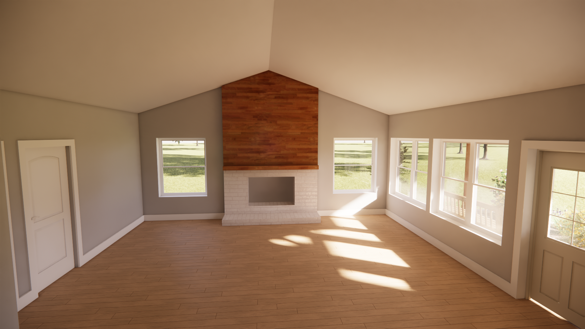 you are a professional rendering service offering the highest quality renderings in the world render this living room with furnishings curtains on the windows a tv above the mantle and a fire in the fireplace keep all windows as they are where they are only one sage green accent wall behind fireplace