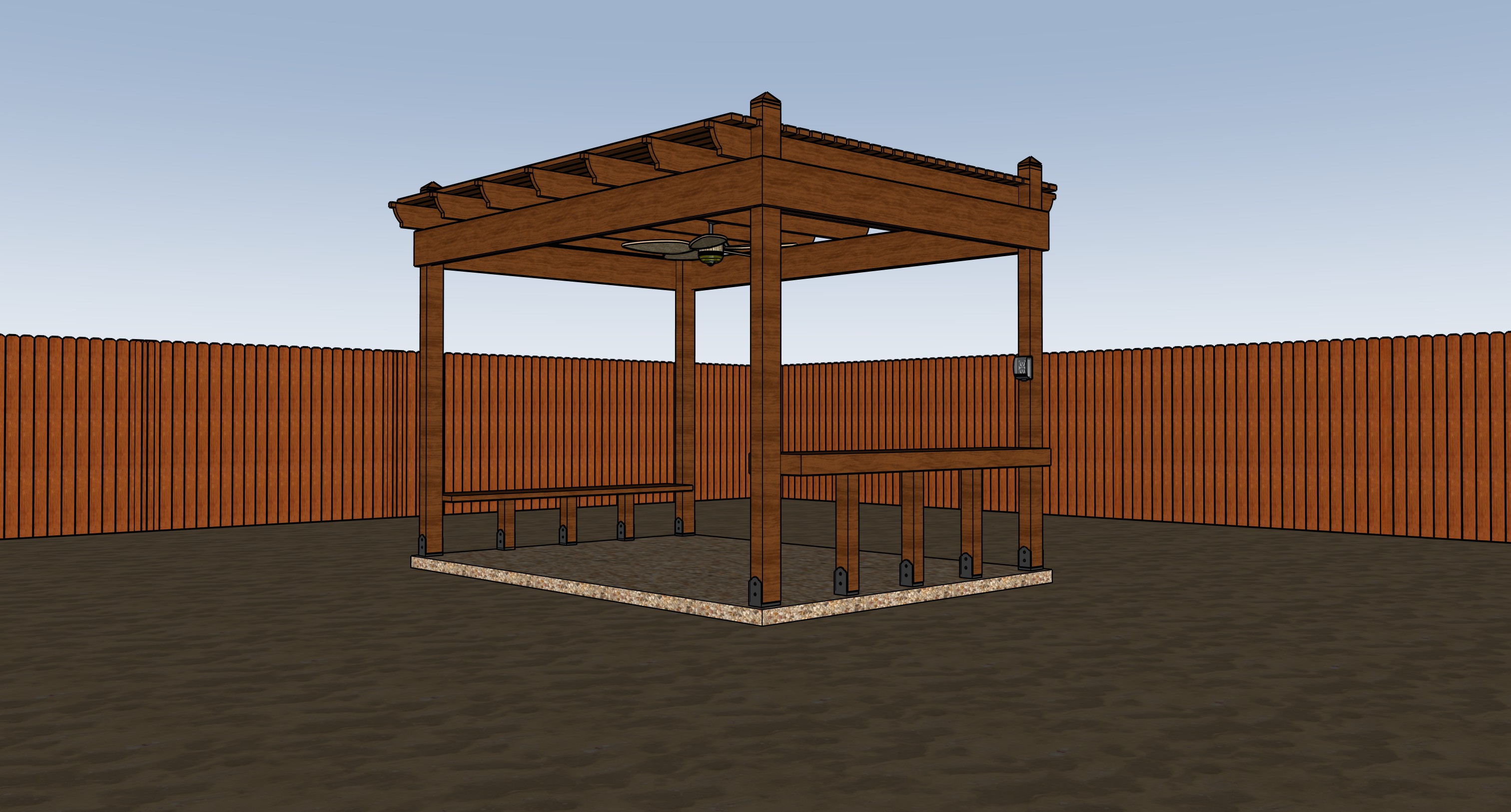 create a highly realistic architectural rendering of a wooden pergola with accurate proportions positioned on a finished patio surface surround the pergola with a clean horizontal slat fence and landscaped areas featuring shrubs soft greenery and ground cover use warm natural sunlight soft shadows and realistic materials such as stained wood matte metal brackets and stone or concrete flooring apply cinematic lighting high resolution textures depth of field soft background blur and premium architectural photography styling emphasize natural wood grain crisp reflections and a bright minimalist color palette to create a refined polished luxury outdoor environment