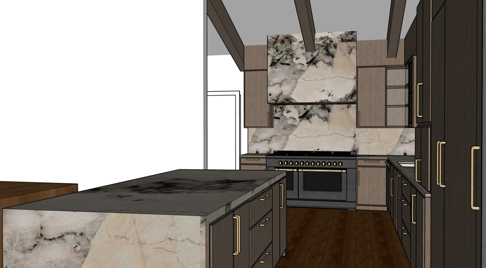 render kitchen with ambient lighting latte color cabinets brass handles