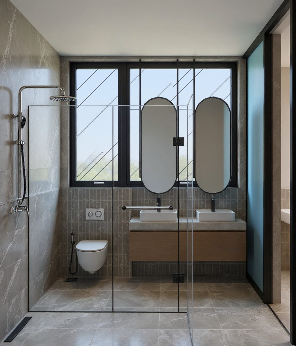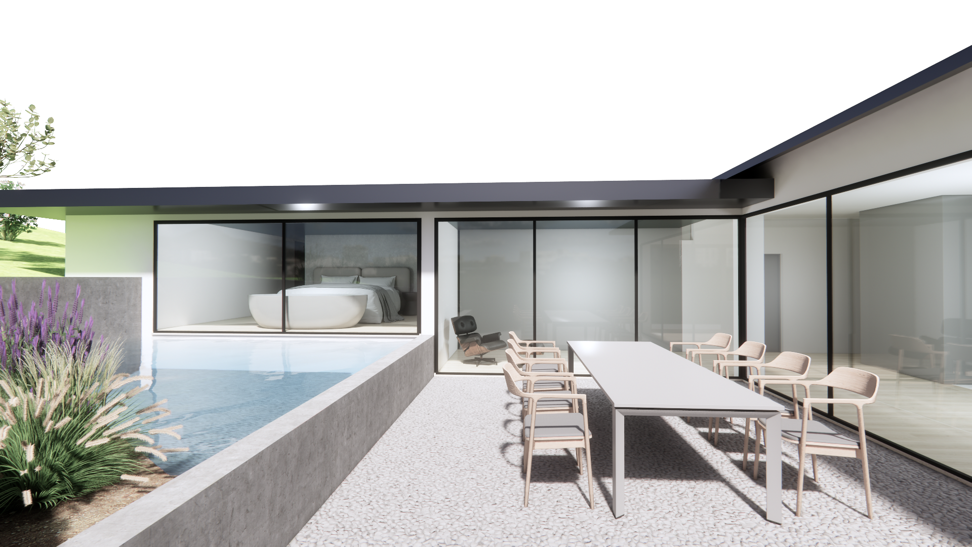 keep the entire scene exactly as it is do not change or interpret anything do not modify the architecture geometry openings proportions furniture pool vegetation backgrounds interior layout or any objects inside the rooms keep every element in the exact same place and shape as in the original image do not add anything do not remove anything do not fill empty spaces do not change the bedroom with the bed and bathtub do not change the middle room with the single armchair do not add anything to the empty room on the right do not change the background or landscape do not change the camera angle or framing only enhance the image by making it more elegant more minimal cleaner more realistic with improved lighting better materials refined reflections soft shadows high end minimalistic atmosphere window frames should appear thin and black but only visually do not change their geometry focus purely on visual quality and realism nothing else architecture