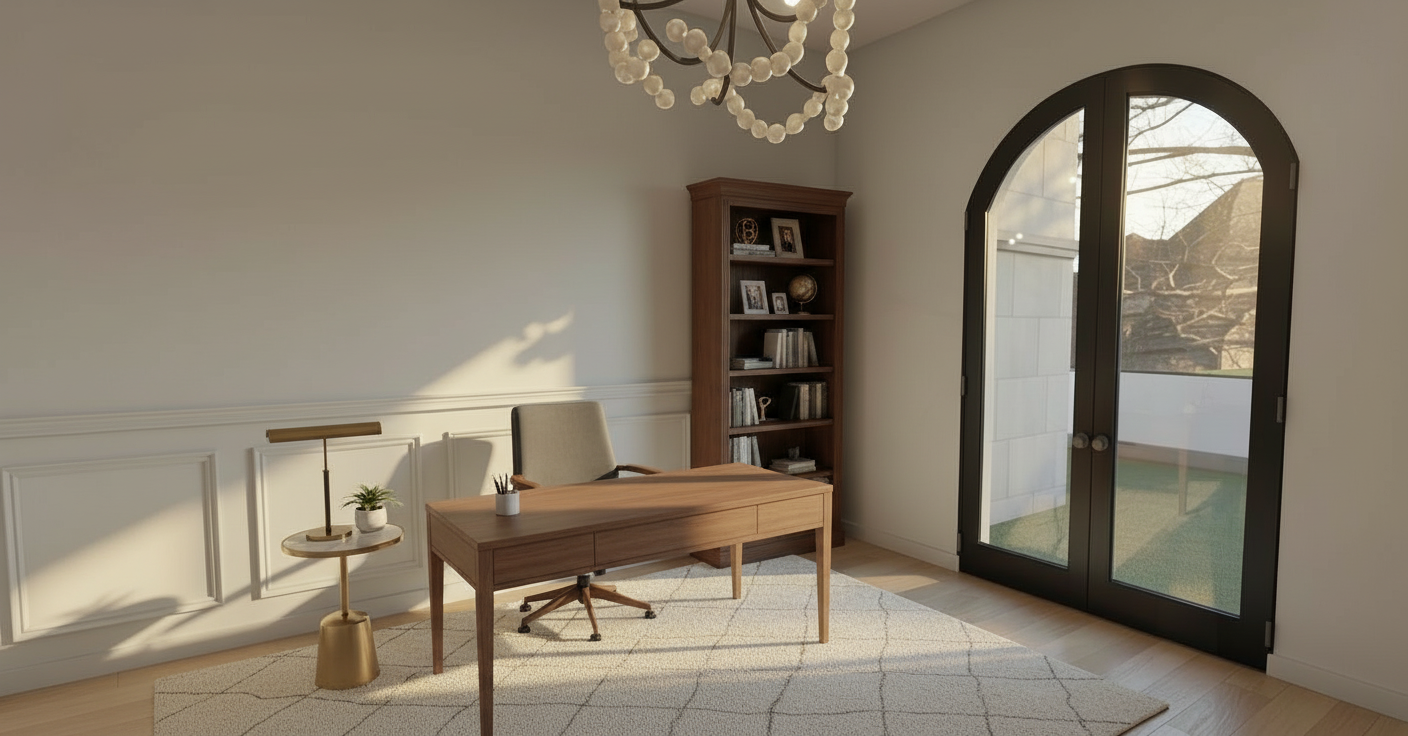 create photorealistic perspective of this home with the current materials do not change materials white brick on entire home with black siding black windows black trim black shingle roof nighttime scene with lush vegetation in a suburban setting