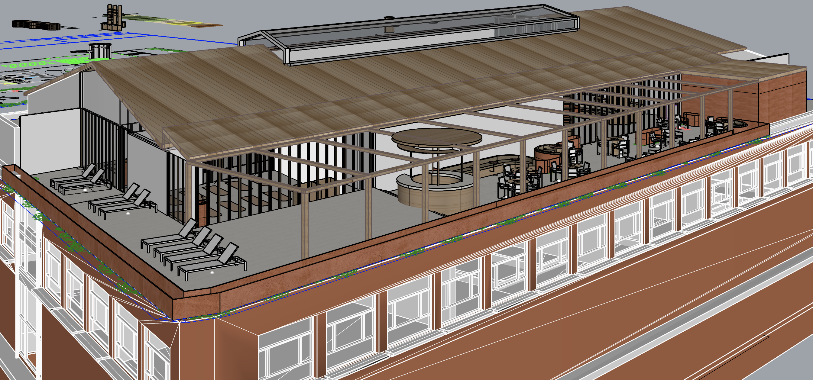 make floor of the rooftop light terrazzo that is there now in the model make the solid walls facing outwards terracotta make the roof planks of wood make shading system on the structure above the terrace put plants in the terracota planters along the edge and the built planters further in on the terrace along the walls as you can see make the white wall inside in the room with the yoga mats reflect like it is covered in mirror the wall facing out from that room is glazings with wooden frames