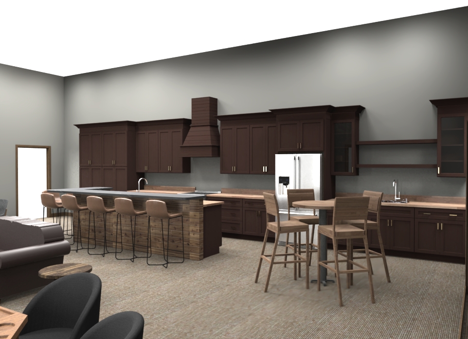 create a photo realistic image from this hunting lodge floor plan mocha stained oak cabinets with bucherblock tops and a black granite bar add deer and duck mounts to walls ceiling is vaulted toward the hood and painted black add liquor bottles and glasses to wet bar shelves on right end of kitchen