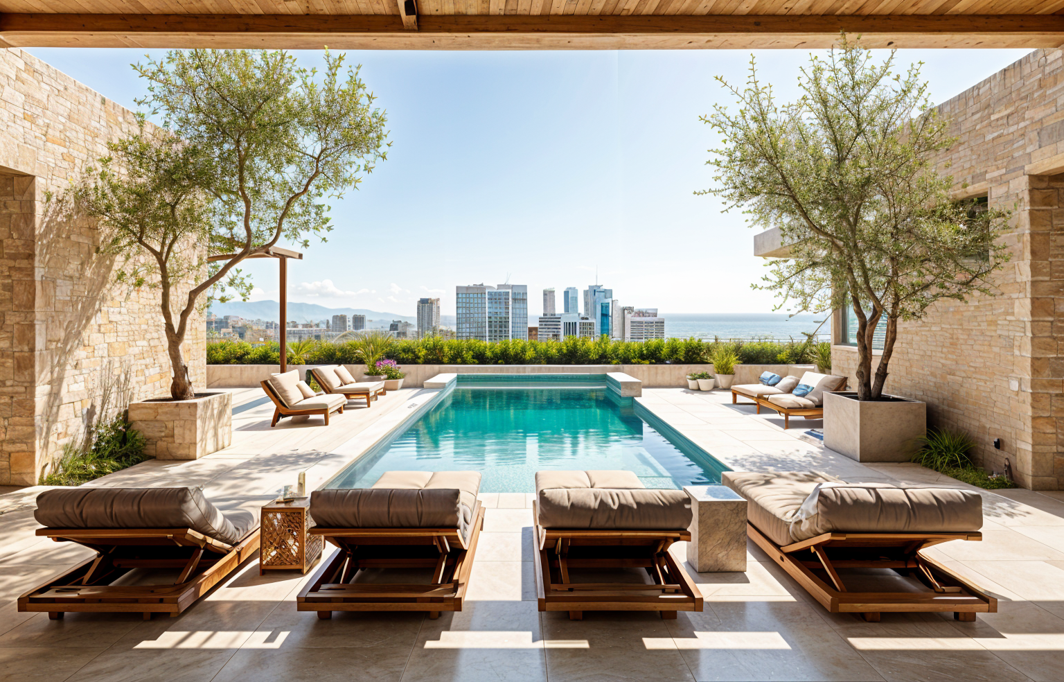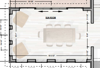 using this floor plan create an interior render of a sunroom with a long wooden dining table and two comfortable white upholstered chairs at the far end