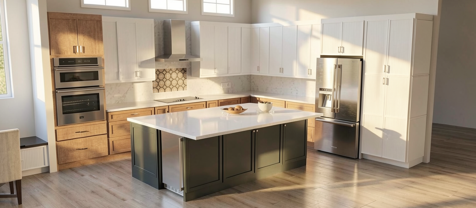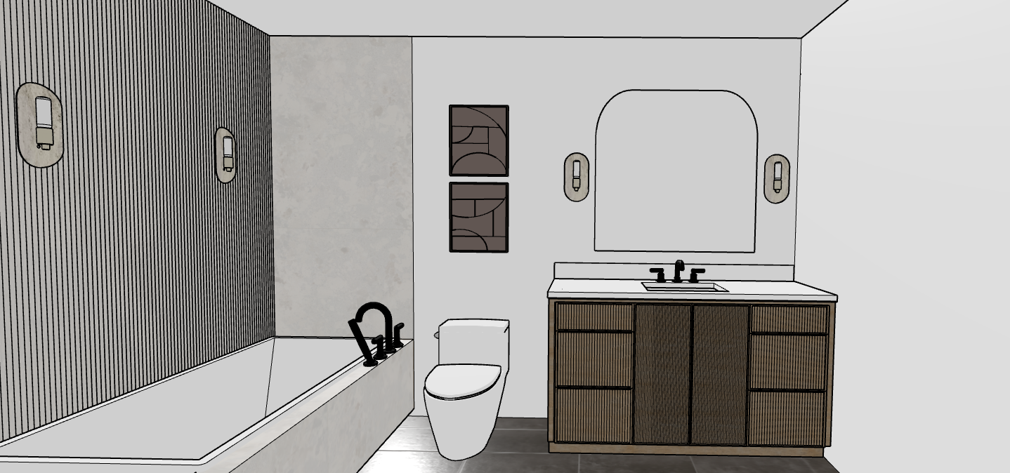 luminous bathroom stained oak vanity with reeded doors travertine wall sconce black granite floor tiles and wall tile in greige stone walls are white