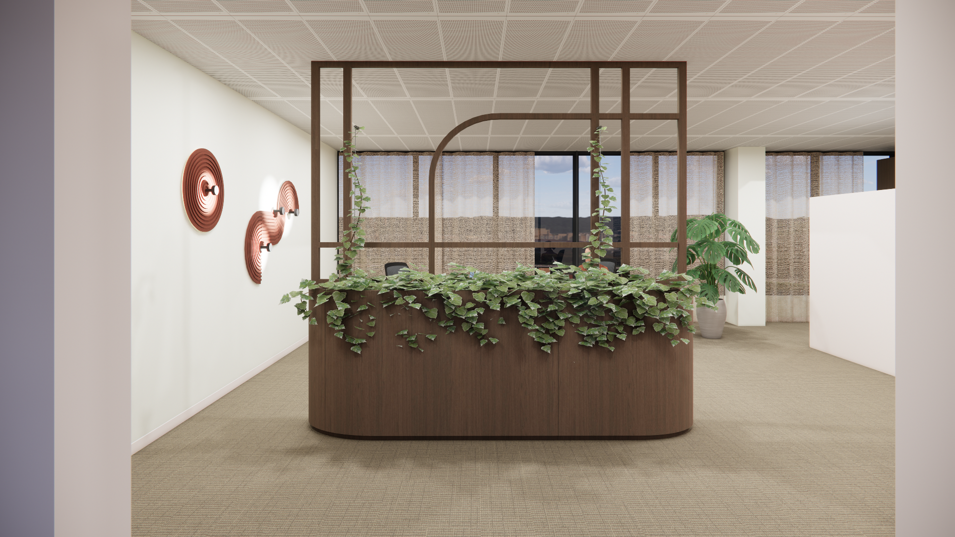 modern office interior featuring a central wooden partition with cascading green vines adding a touch of nature to the space the background showcases a panoramic window town view with a serene sky the lighting is soft and natural casting gentle shadows the ceiling is detailed with a textured white panel design complementing the clean minimalist warm beige carpet enhancing a calming elegant atmosphere with linen beige curtains along the large windows