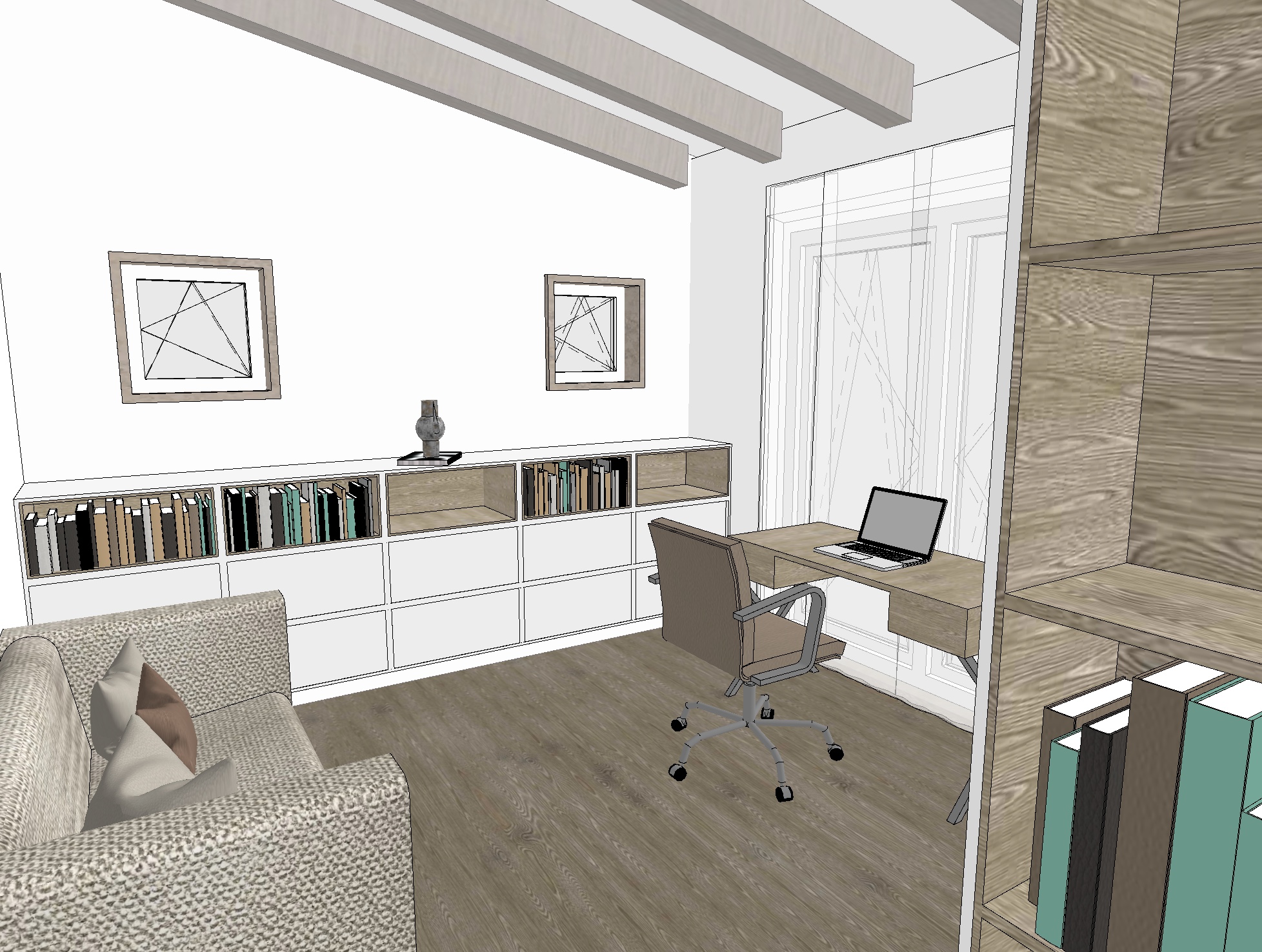 keep interior design and furniture position as it is realistic photo of a home office in daylight bright and welcoming atmosphere white walls ral9016 white built in cabinets ral9016 open shelves in light stained oak wood non red or non yellow oak wood wooden desk in a light oak with chrome legs light white semi transparent curtains ergonomic vitra desk chair with light leather upholstery and chrome frame white ceiling beams jab taupe fabric sofa folded keeps the position as it is decorative office elements such as books binders and vintage accessories macbook laptop notebooks crystal water glass and coffee cup on the desk warm 2700 k lighting harmonious composition tidy and elegant workspace with a cozy lived in feel no orange or yellow material look the two square windows shows outdoor background and are involved in the shelf system ceiling has no lights book shelf has artificial light but no yellow tone