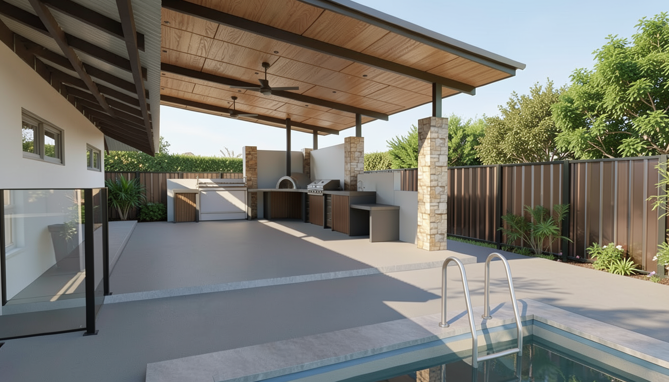 add outdoor lounge mediteranian feel white washed walls metal colourbond fencing in light cream colour black coloured beams black coloured fence posts change window on wall to television re ove gravel