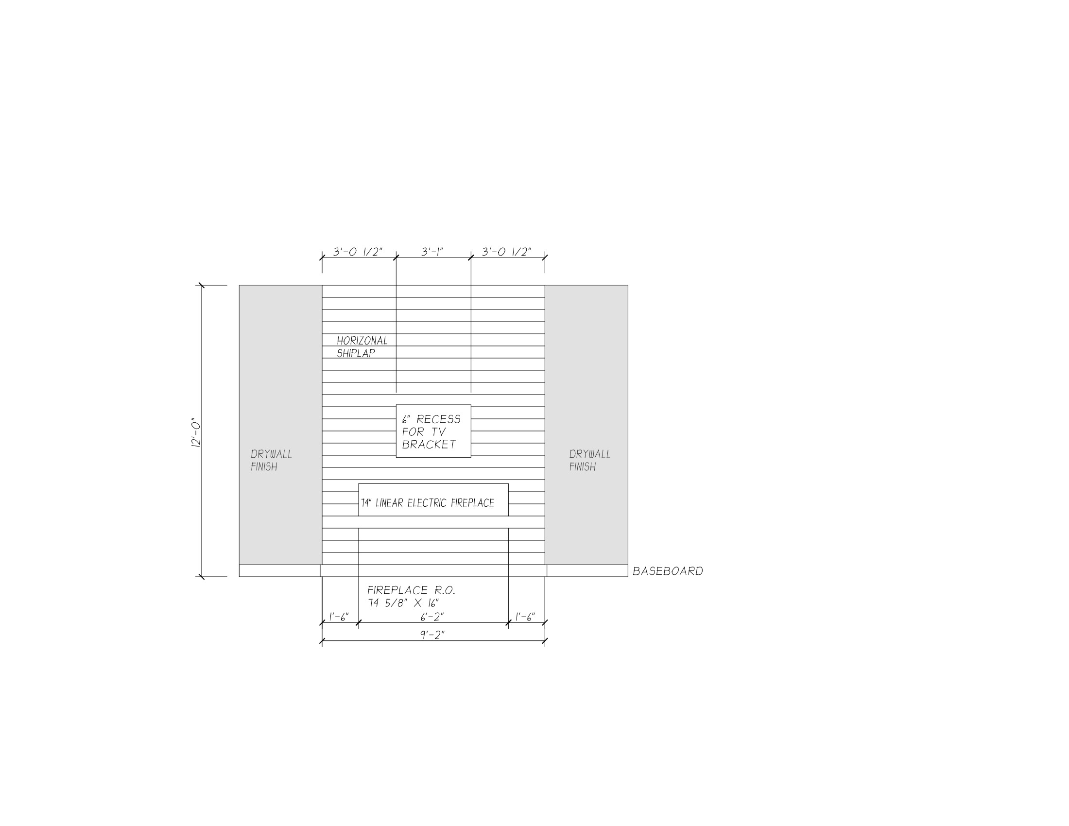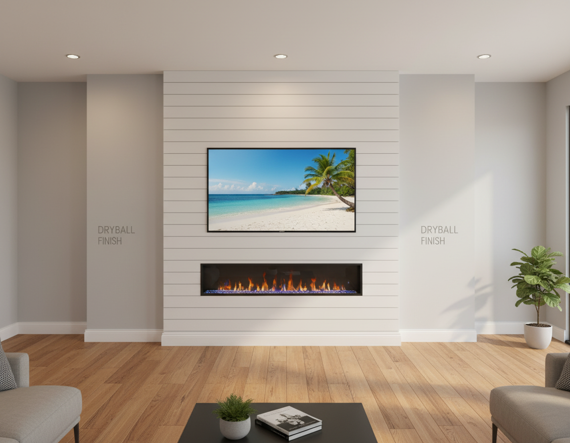 generate a wall feature that is 16 wide and 10 high the center section is 9 2 wide and 10 high and protrudes 6 the center section has a 74 wide and 16 high linear electric fireplace that is 30 above the floor show an 80 tv with a beach scene centered over the electric fireplace with 12 from the top of the fireplace to the bottom of the tv the center section that protrudes out 6 will have 6 horizonal shiplap boards painted white the side walls will be drywall finish painted light gray there is a 6 white painted baseboard across the entire 16 wall only show the 16 wall width with a potted plant in front of each drywall section