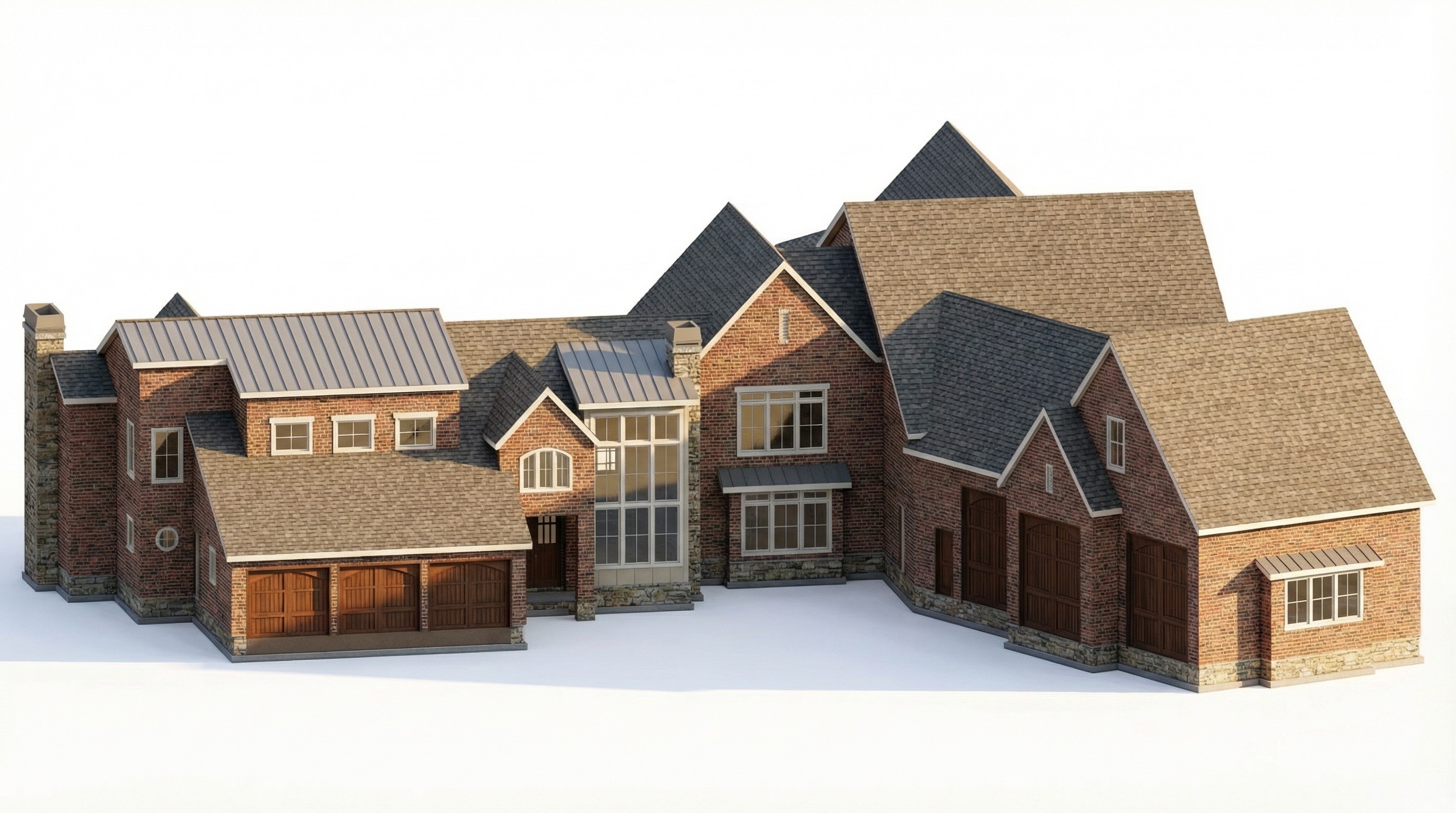 render a 3 d realistic image do not change the layout or structure maintain the 30 degree angle keep all windows doors and garage doors as they are add a driveway landscaping trees blue skies with subtle clouds