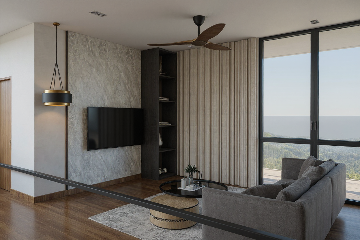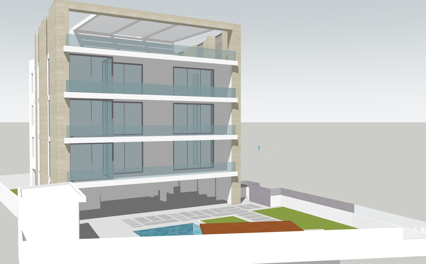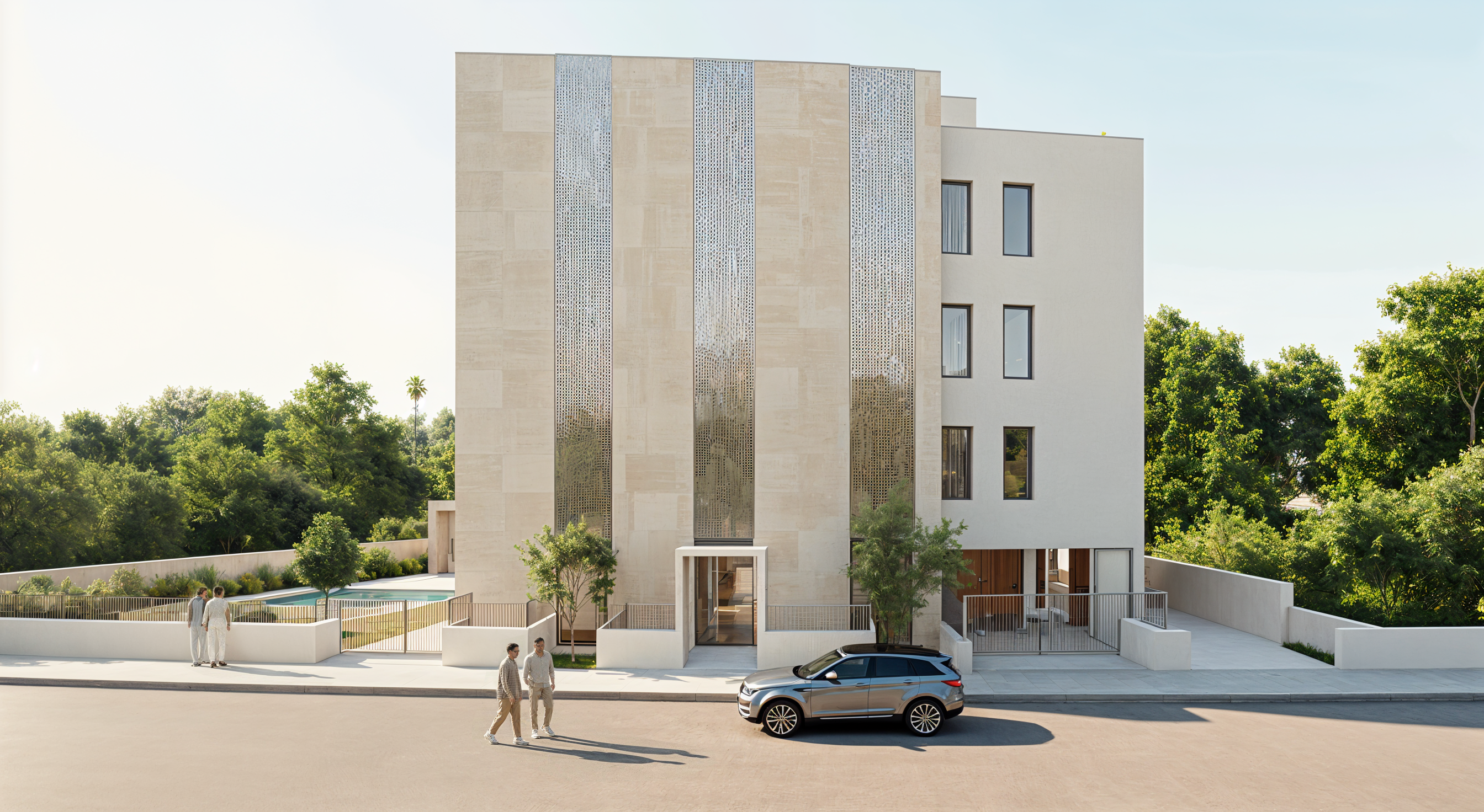 exterior shot scene use the uploaded base model as the geometry and recreate it in a clean bright high end architectural visualization but at night time keep the building proportions balconies pool area follow the moodboard style for materials landscape and realism lighting clear night with artificial lighting from the swimming pool and building soft even illumination across the entire scene no harsh long shadows no deep shadows no strong directional contrast remove all dark shadows on the foreground road building fa ade pool area and inner courtyard the lighting should feel like a bright mediterranean midday with a clean sky and diffused sunlight architecture pools and balconies should be evenly lit sky must be clean bright and cloudless architecture replace all placeholder fa ade materials with realistic ones main exterior change all beige walls to modern light beige travertine cladding with soft horizontal texture warm undertones matte seamless secondary white surfaces smooth clean white plaster balcony ceilings warm natural wood panels balcony railings transparent glass with realistic reflections window frames slim dark aluminum materials stone texture subtle and elegant no heavy patterning glass must show inside lighting and interior sky wood must be warm and matte pool water clear bright blue with mild specular highlights landscape replace all empty terrain with organised maintained landscaping add trimmed green grass in the background add a small number of mediterranean city trees olive type or ficus type add neat shrubs along the pool and fence line no wild vegetation no dry bushes ground road add realistic light or medium gray asphalt road in front of the building keep the pavement clean with soft ambient light style photorealistic bright clean mediterranean residential architecture high end v ray corona style no dramatic shadows restrictions do not change the building geometry do not change pool layout pavilion fence shape do not change the camera angle only improve materials landscape and lighting as described