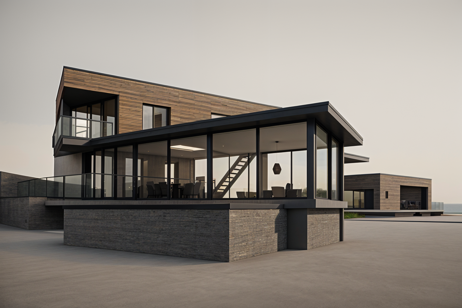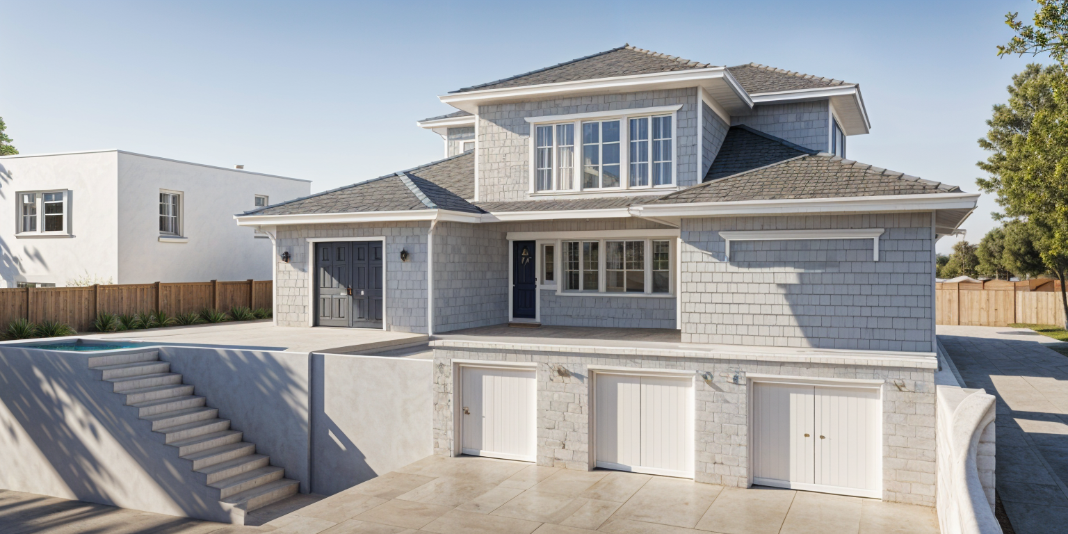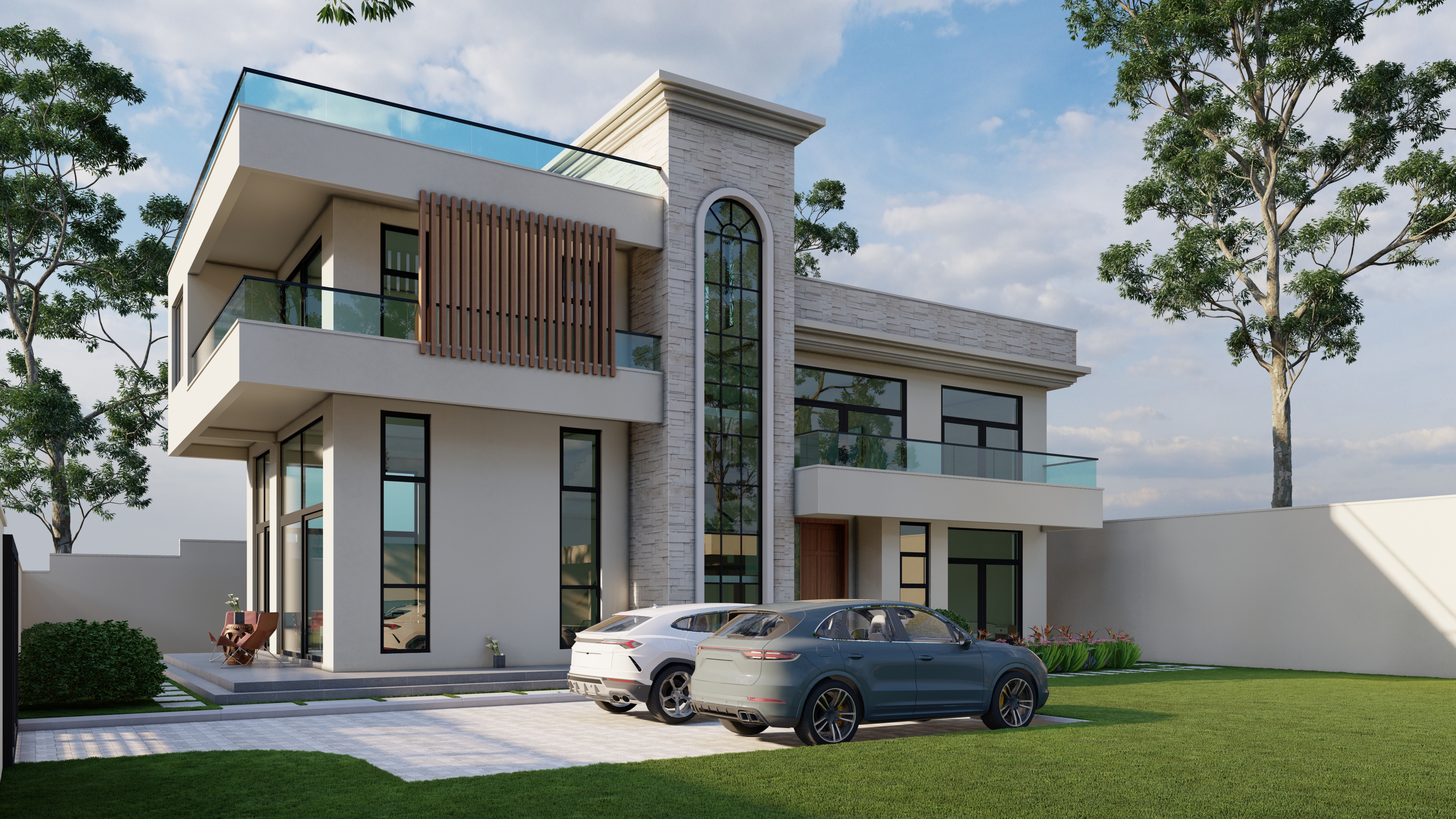 a modern two story house with a sleek design featuring large glass windows and a stunning balcony the exterior walls are clad in light gray stone contrasting beautifully with the stainless steel frames of the windows and railings the balcony is accentuated by clear glass panels creating a seamless flow and elegant look the surrounding garden has lush vibrant green grass adding a natural touch to the modern architecture the sky is bright and clear providing a fresh and inviting atmosphere use soft beige for the walls adding warmth and sophistication while the roof is a deep charcoal gray to enhance the modern aesthetic