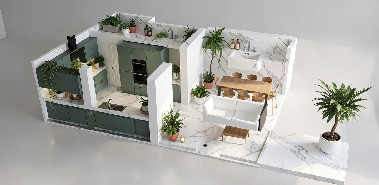 convert this floor plan into a modern isometric 3d view of a full house show the space from an elevated angle with furniture walls and details visible very dark oak haringbone floor furniture from baxter glass doors next to kitchen more tables with marble top are carpets light collor use the same furniture as shows on the plan do not change the orientation of the floorplan