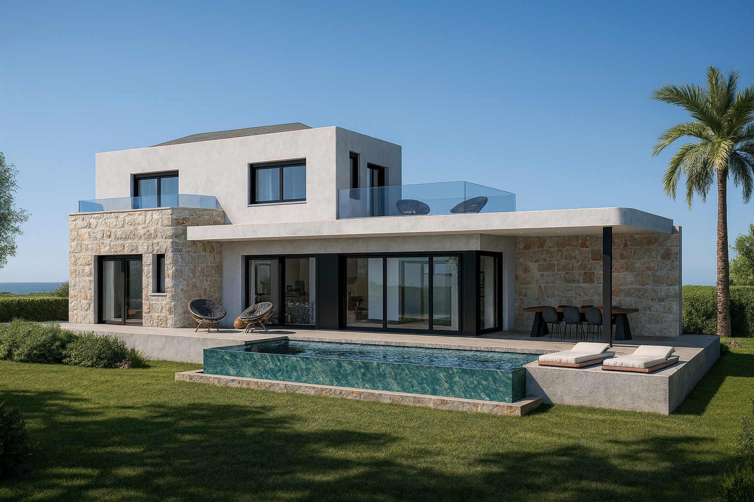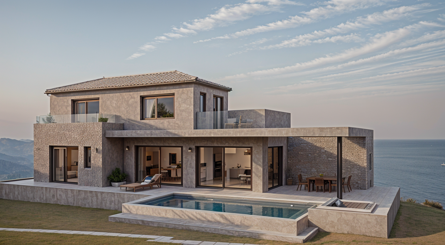 romantic white stucco with wood columns corbels and accents red clay tile roof ornate detailing around the doors architecture
