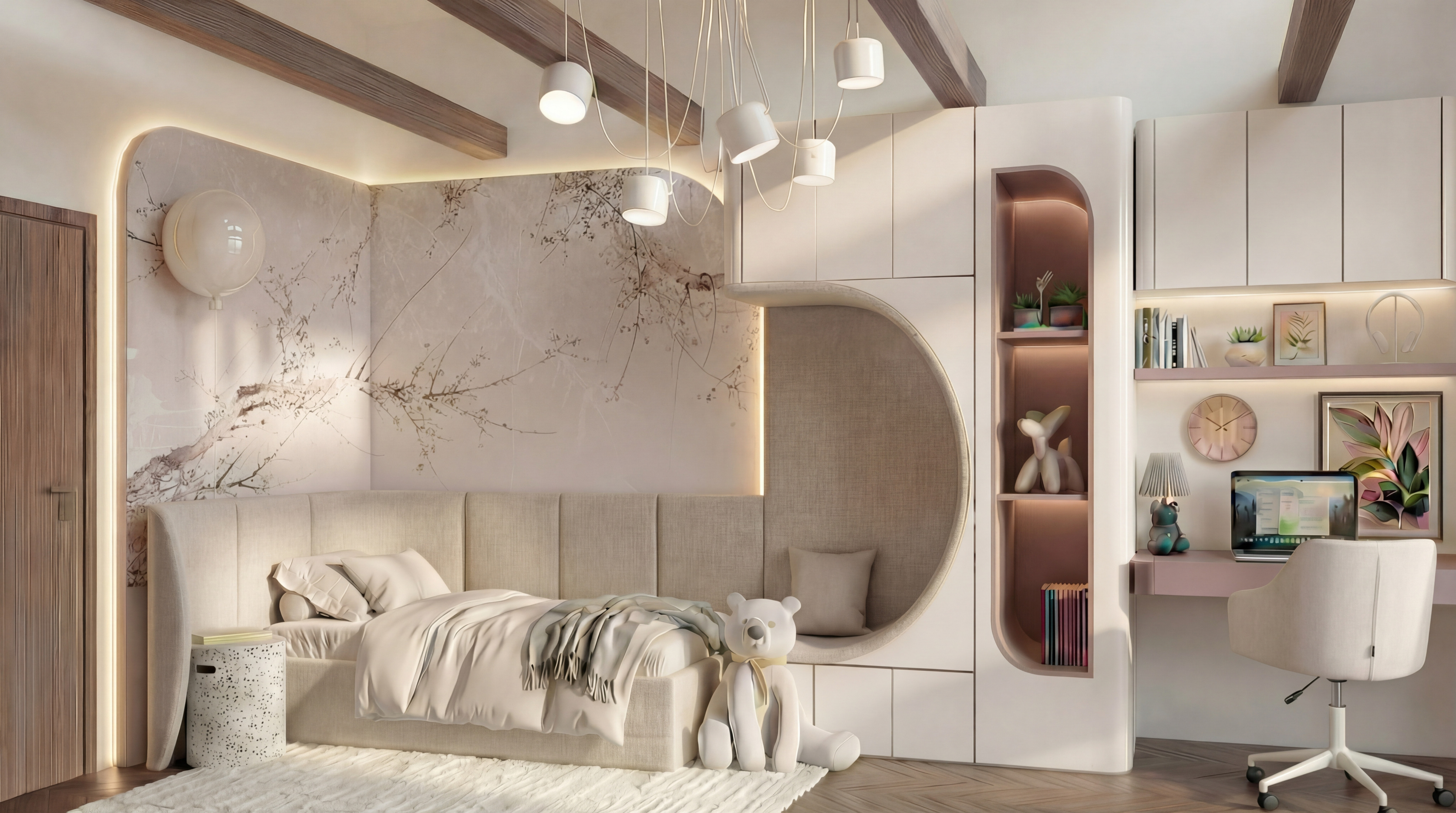 enhance this interior render into hyper realistic photography keep the design furniture layout and colors exactly the same increase natural daylight from the window add soft volumetric sun rays and subtle dust particles in the air improve material realism with micro textures on fabrics and natural surface imperfections reduce yellow tint and balance to neutral daylight add realistic contact shadows and subtle reflections on floor and glass introduce very slight depth of field and minimal smartphone lens characteristics for real life authenticity maintain elegant soft atmosphere do not redesign or move any elements