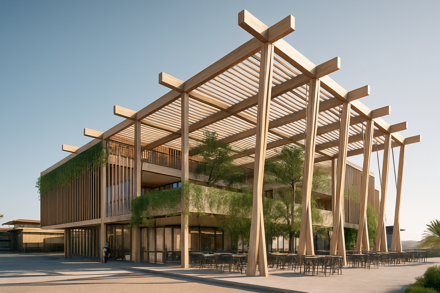 mass timber design wood beams columns with hanging plants fill with life sun shining dynanimc sky lots of people landscaping