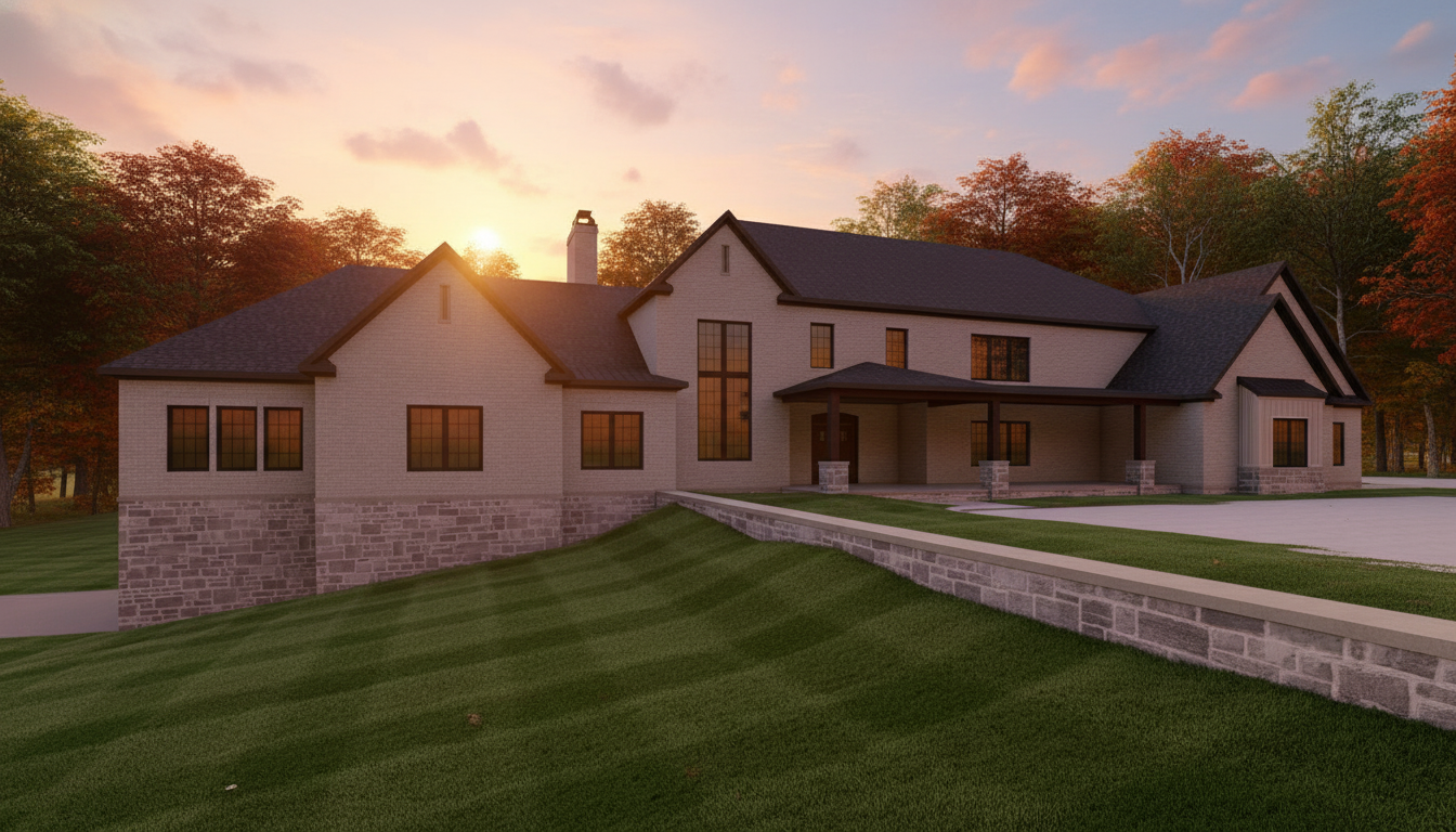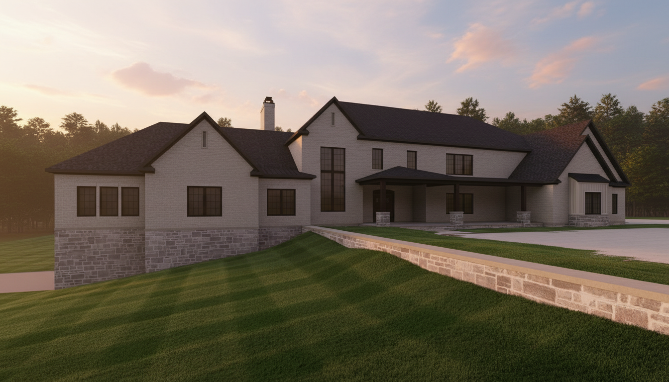 realistic render sunny sky with clouds tall landscape shrubs manicured lawn wooded background