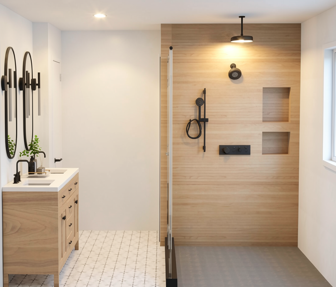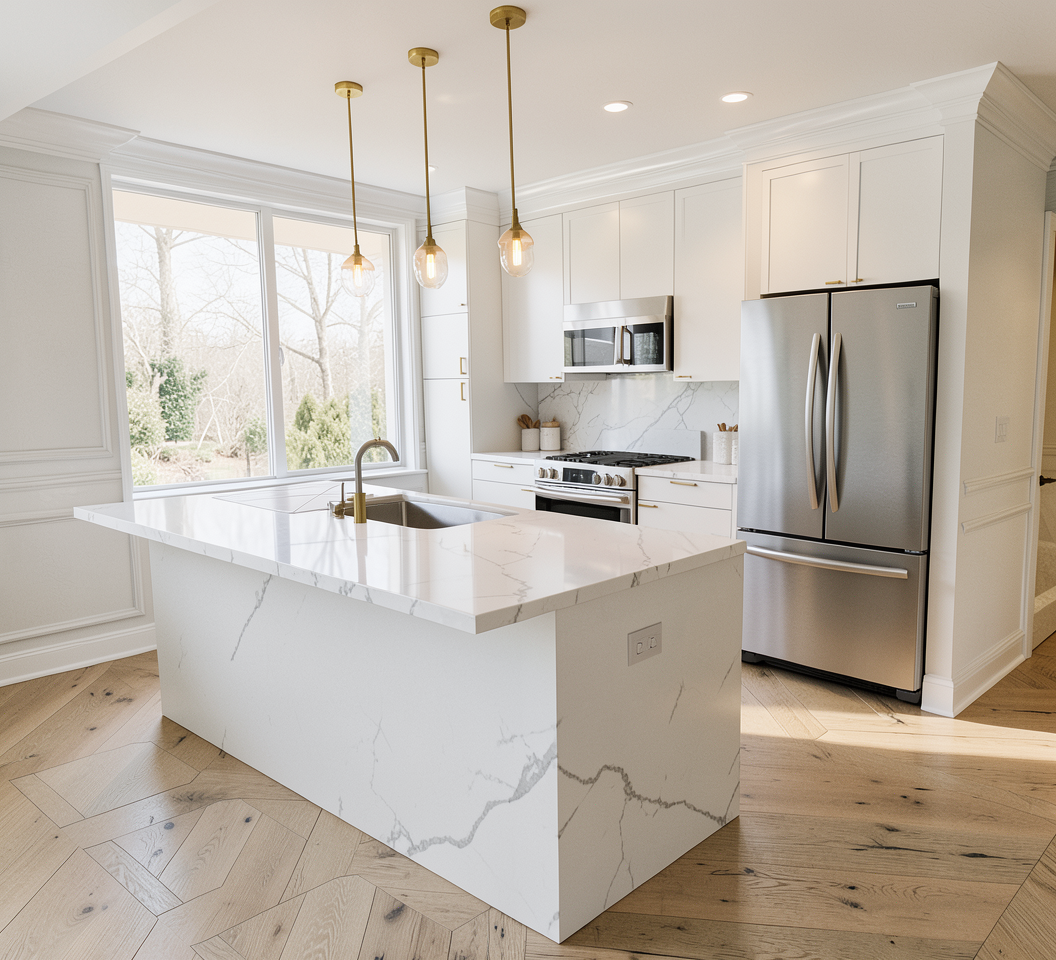 render this kitchen with tafisa cashmere color cbinets bress bar pull hardware and brass plumbing fixtures stainless steel appliances quartz countertop and backsplash with very light grey vein floor to be light oak plank walls to be painted weathered white and base molding to be gloss white