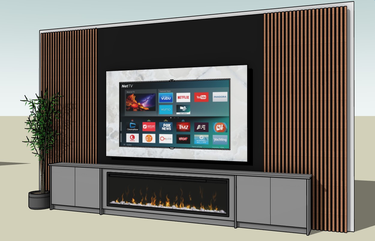 tthis is a tv unit with an electric fire it is very minimalist the background is acoustic panels and black melamine wall panels there is a 70mm gap all around them with led light the tv is mounted on a piece of stone effect material and the cabinet is a light grey colour please render this in a modern sitting room