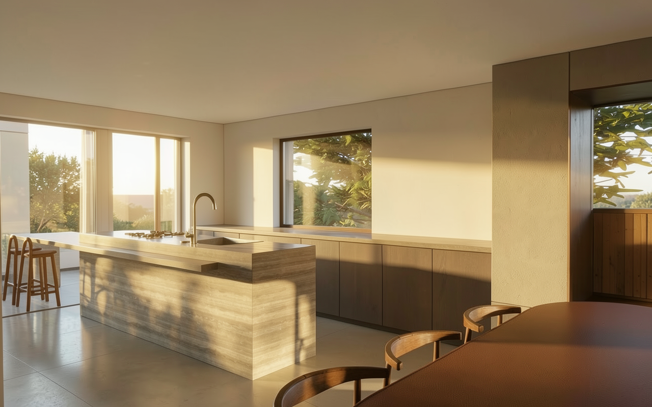 change the wood finish on the kitchen island to make it a mdf a bit lacquered in a dark blue change the wood floor for a lighter stain more beige make the marble backsplash more visible in the back dont make the marble too veiny the wood floor needs to have less wide planks add a persian runner in front of the stove and a bowl of citrus on the kitchen island